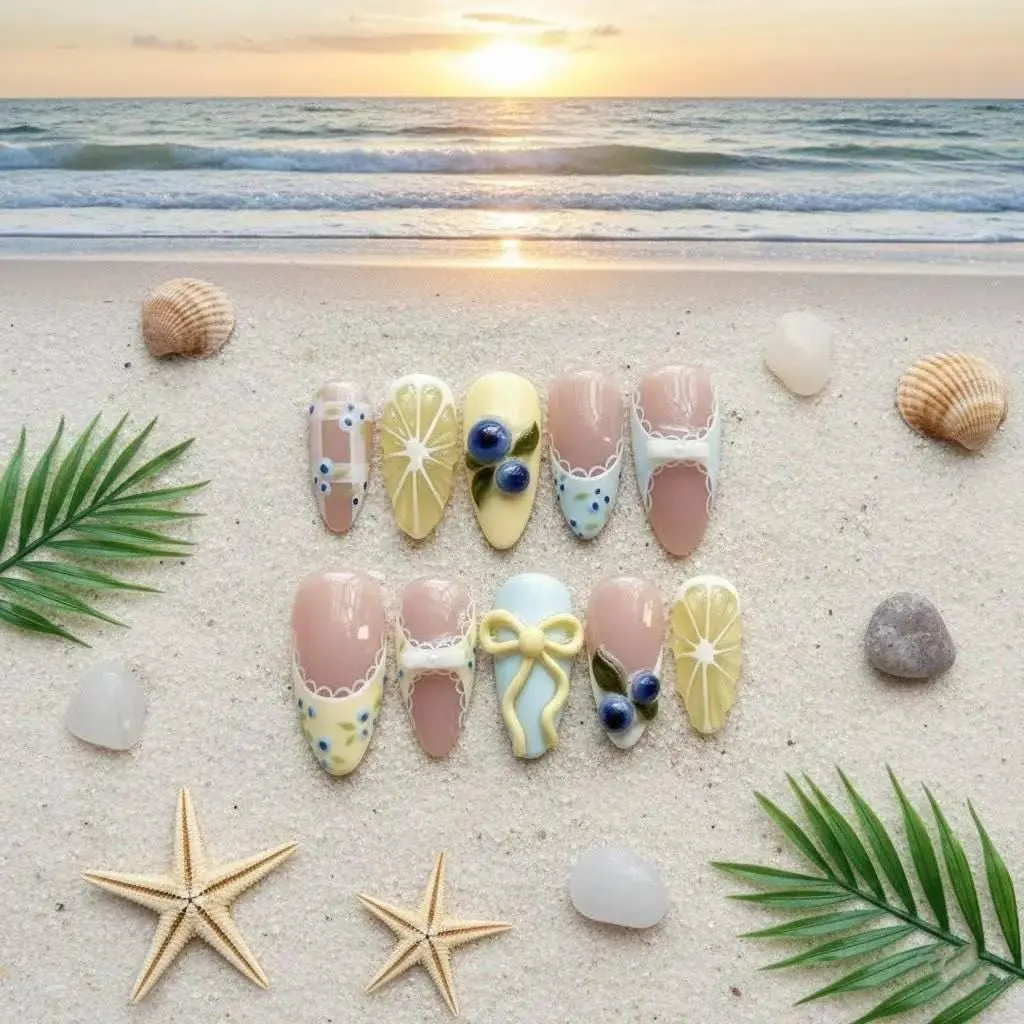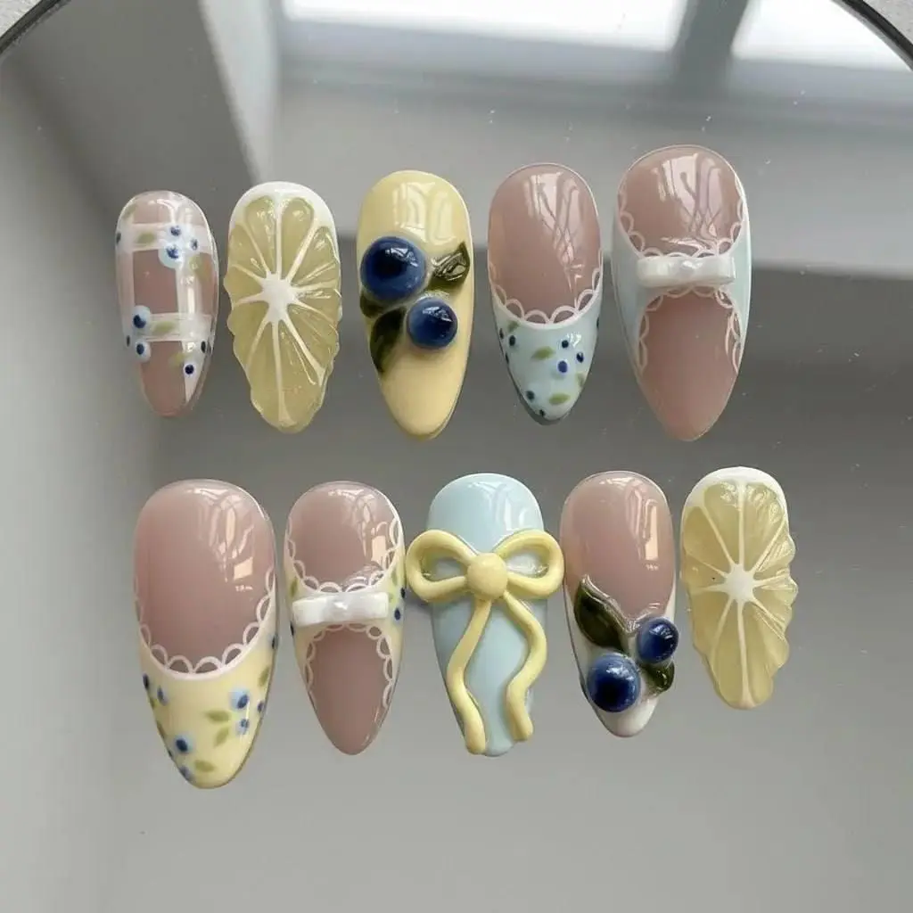 3D Lemon Blueberry Press On Nails: Cottagecore Bow Fruit Nail Art