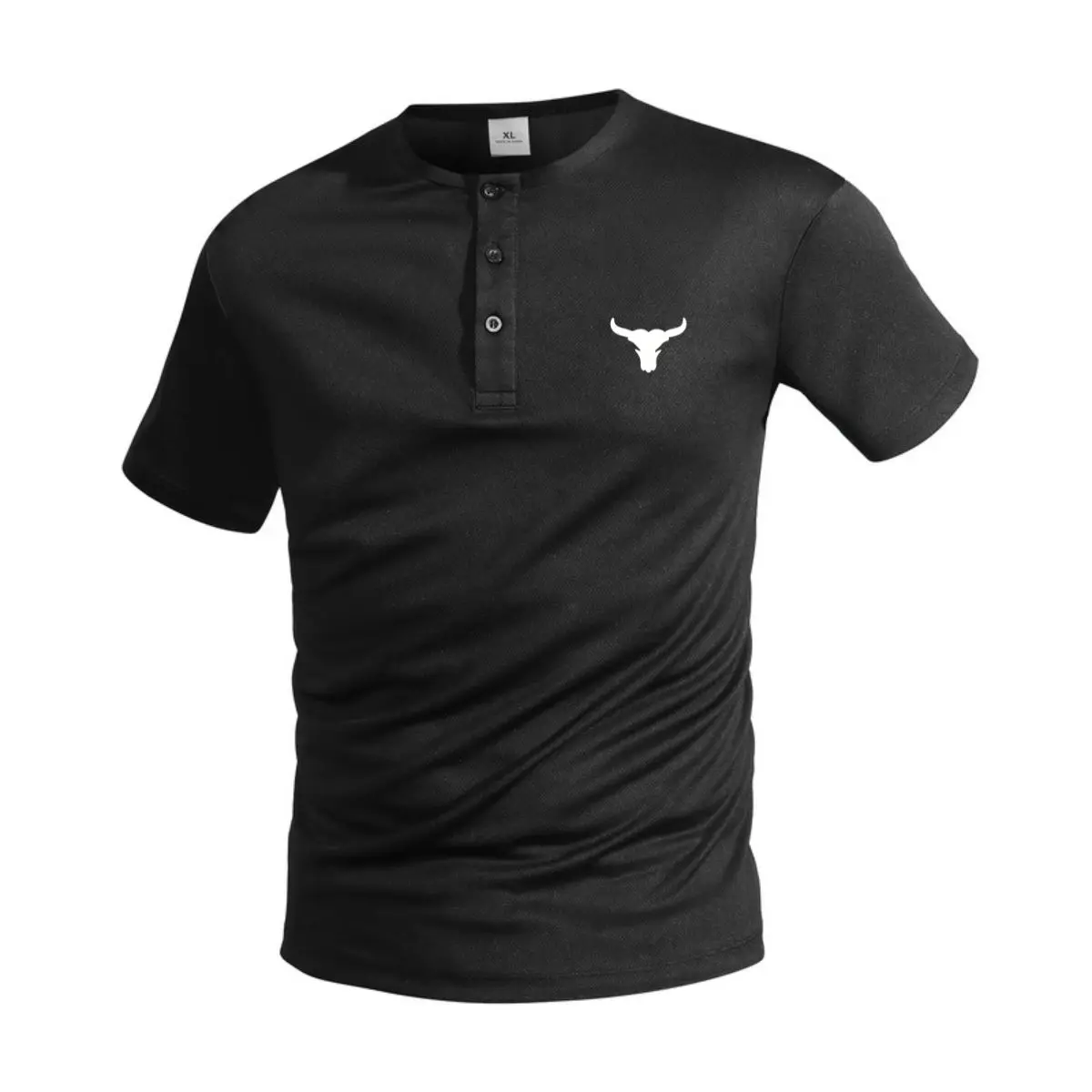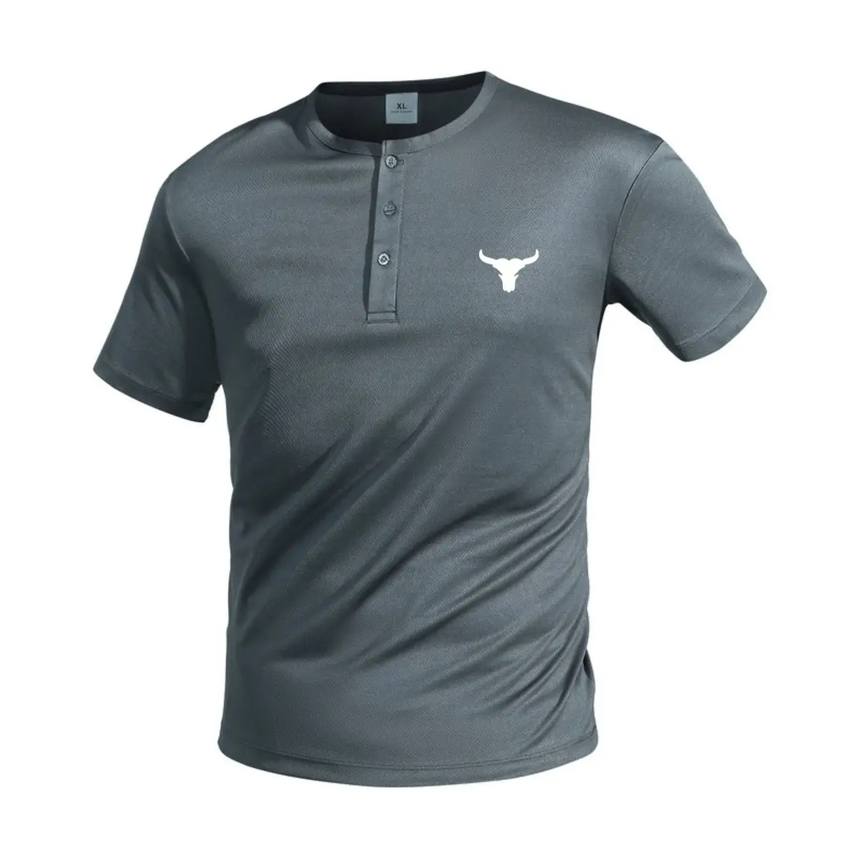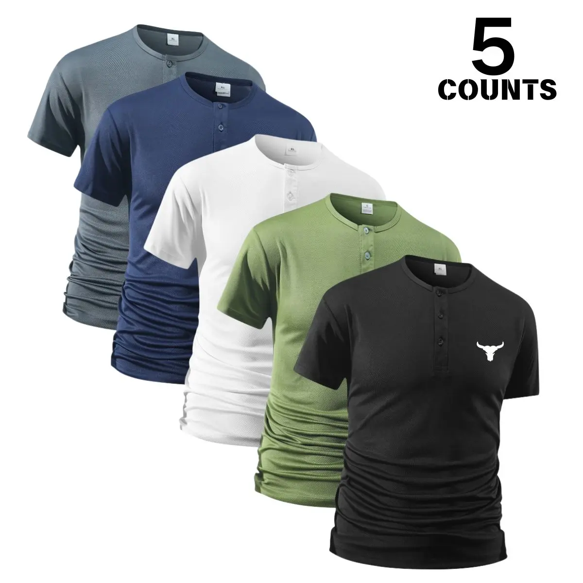 Pack of 5 men’s Henley-collar short-sleeve T-shirts, perfect for summer fitness. These slim-fit athletic tops feature a bull head print, adding a unique touch. Ideal for active lifestyles, they combine style with functionality. Stay cool and comfortable during your workouts.