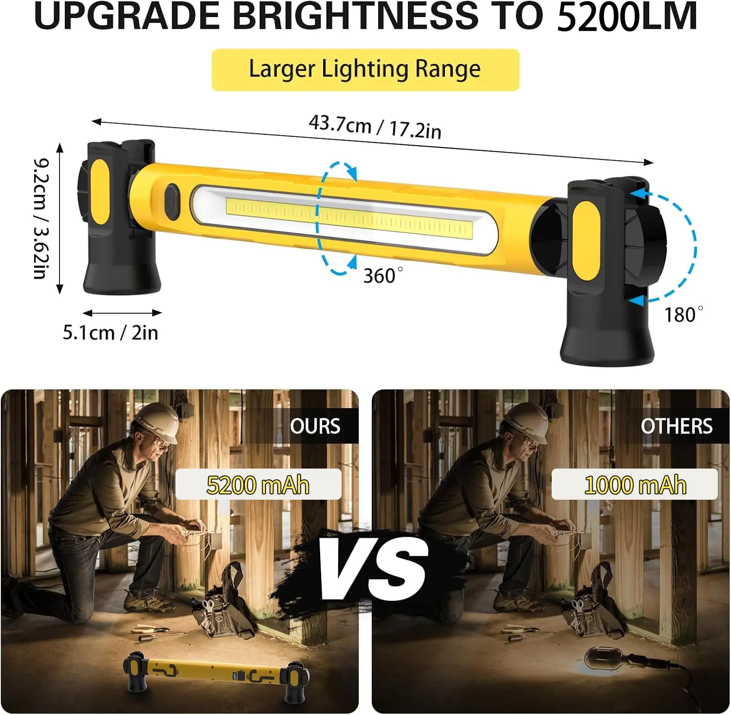 ·Long-Lasting 5200mAh Rechargeable Work Light: Work longer without interruption. Enjoy up to 3.5hrs (High) or 6.5hrs (Low) per charge by convenient USB-C, wherever construction site or camping party. Benefit from fast-charge technology to replenish power in approximately 3.5 hours. Built-in management protects against overcharge, over-discharge, and short circuits.