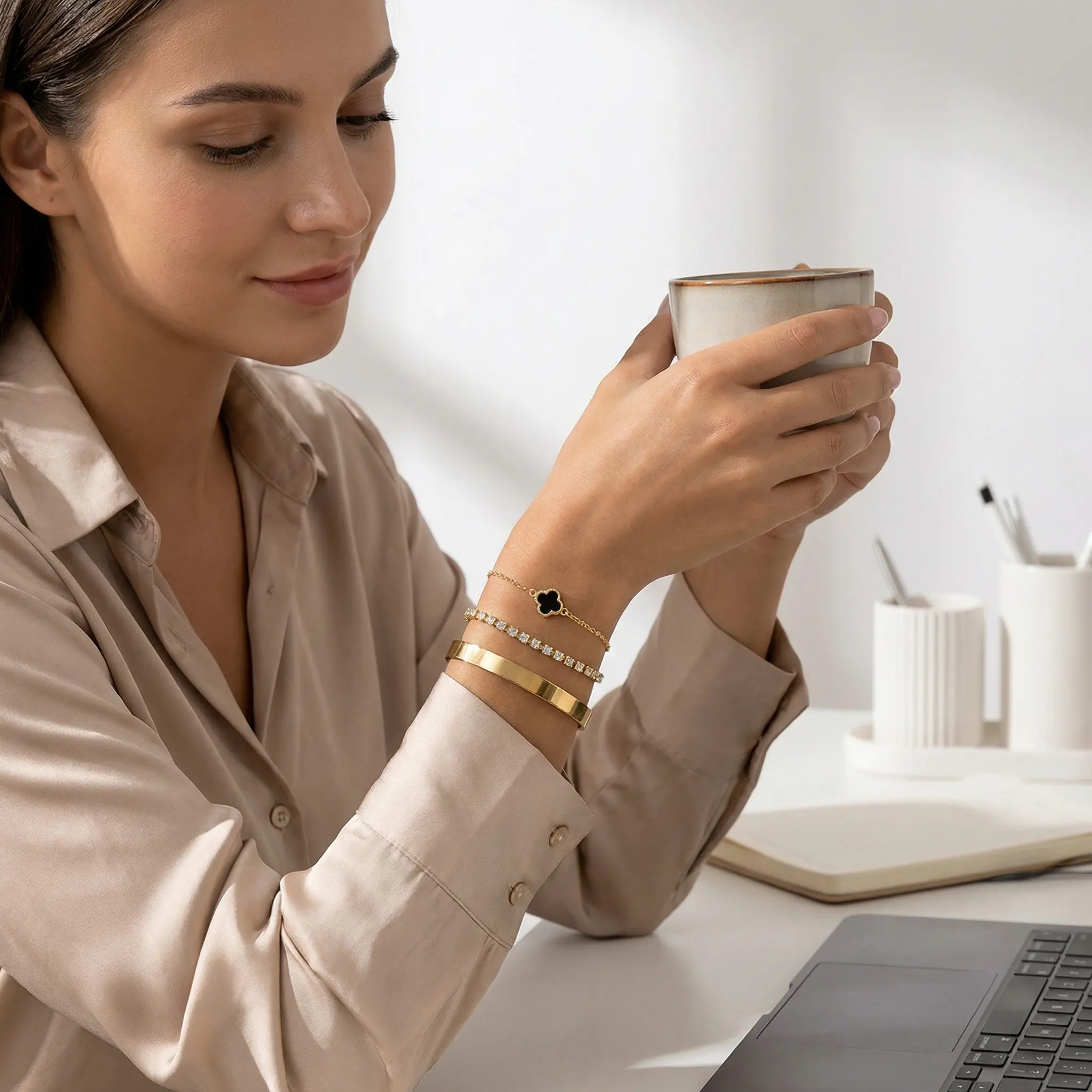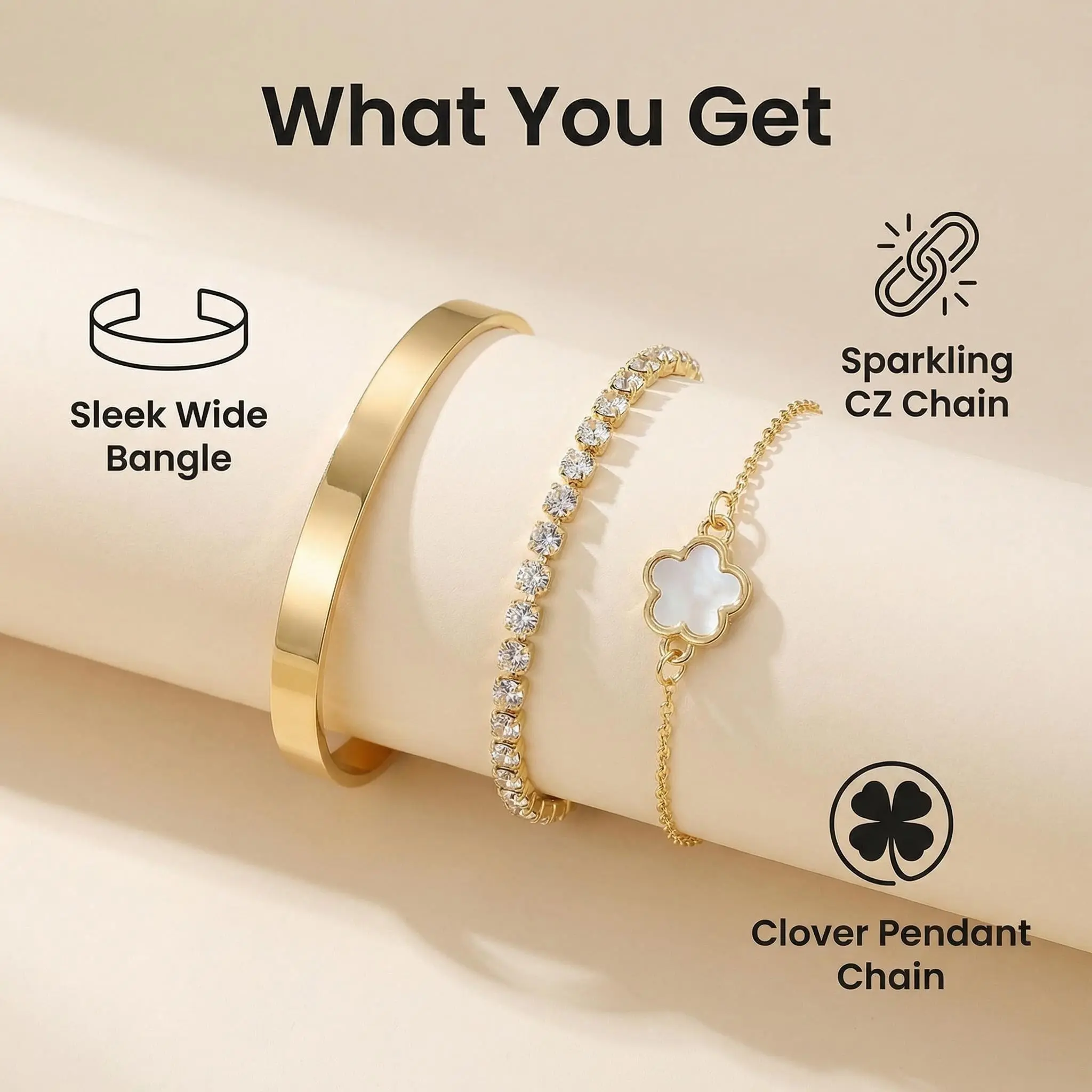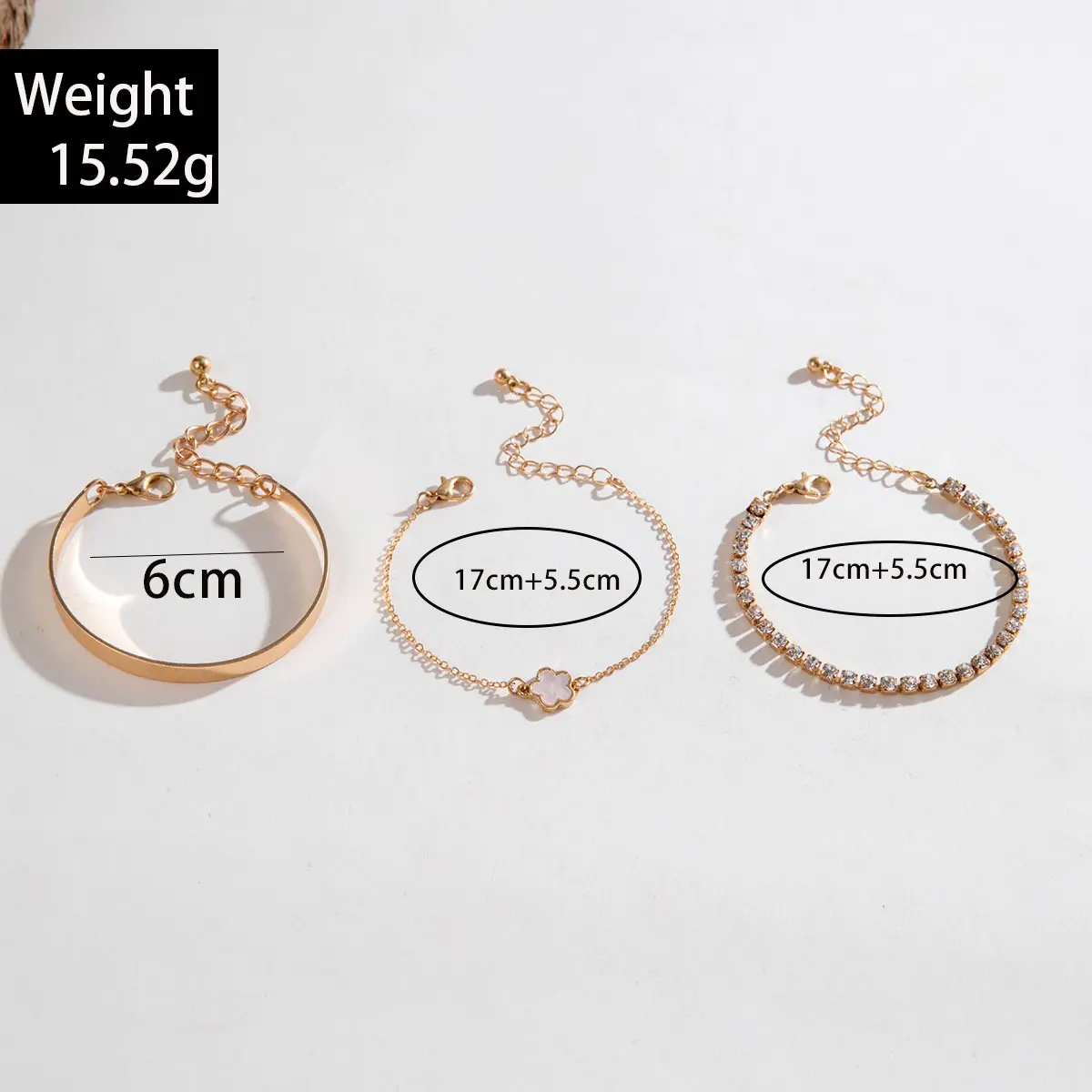 Elevate your daily look with this luxurious gold multi-chain bracelet set. Designed with a glossy wide metal chain for a minimalist and elegant vibe, paired with a delicate rhinestone-studded thin chain that catches light and adds a glamorous sparkle. The set is finished with a beautiful five-leaf clover charm that highlights your outfit with exquisite details. Perfect for fashion bloggers, office ladies, and anyone who loves light luxury style. Ideal for daily commute, friends gatherings, parties, and social media photoshoots. This gold-tone alloy bracelet set is versatile, stylish, and a must-have accessory to complete your chic look.