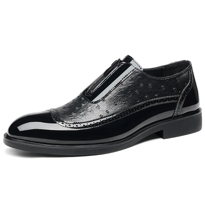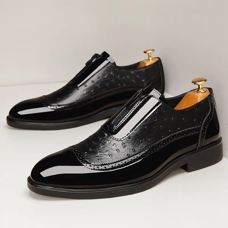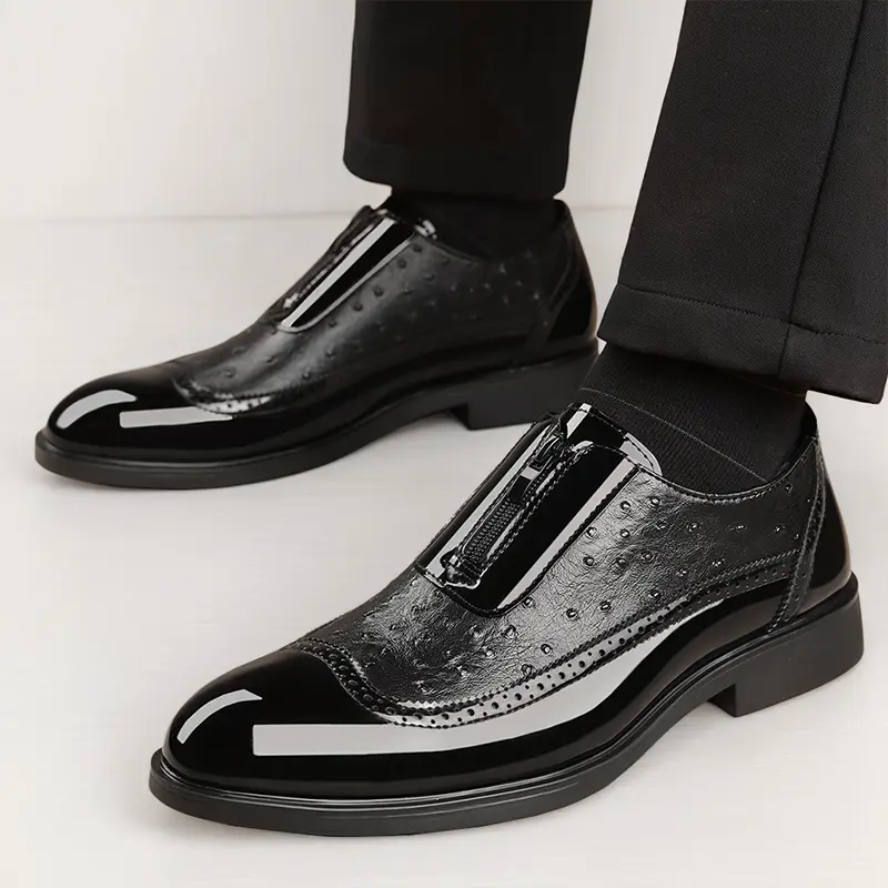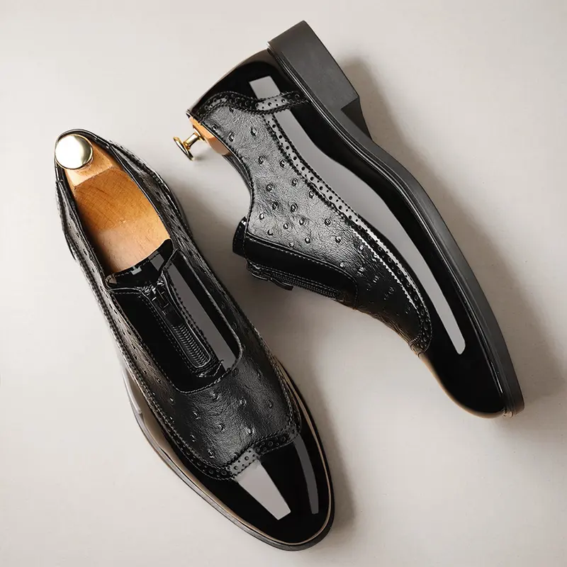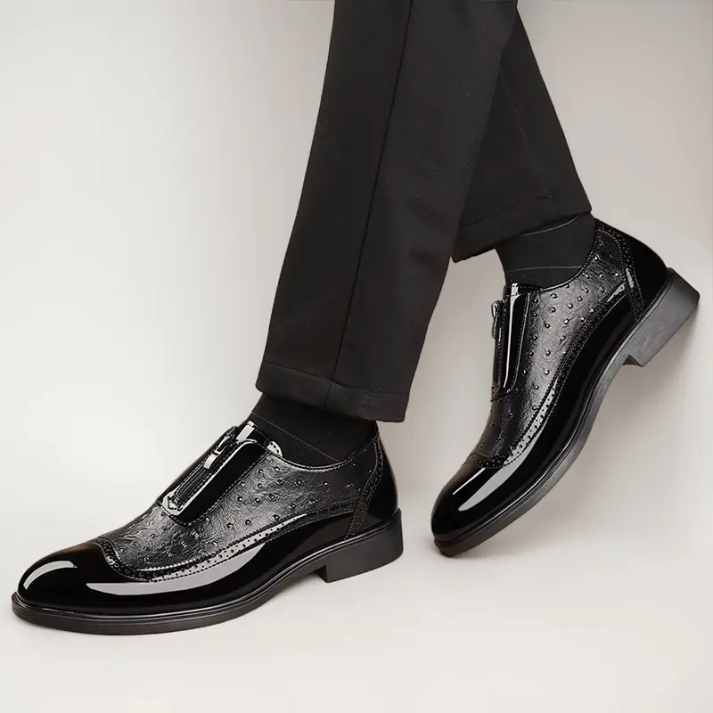 These men's formal loafers feature a luxurious ostrich-embossed upper, paired with glossy patent leather accents and classic brogue perforations for a timeless, upscale look. The convenient front zipper closure adds a modern, practical touch, while the slip-on silhouette ensures effortless on-off wear. The sturdy low block heel provides stable support, making them perfect for business meetings, weddings, and formal occasions.