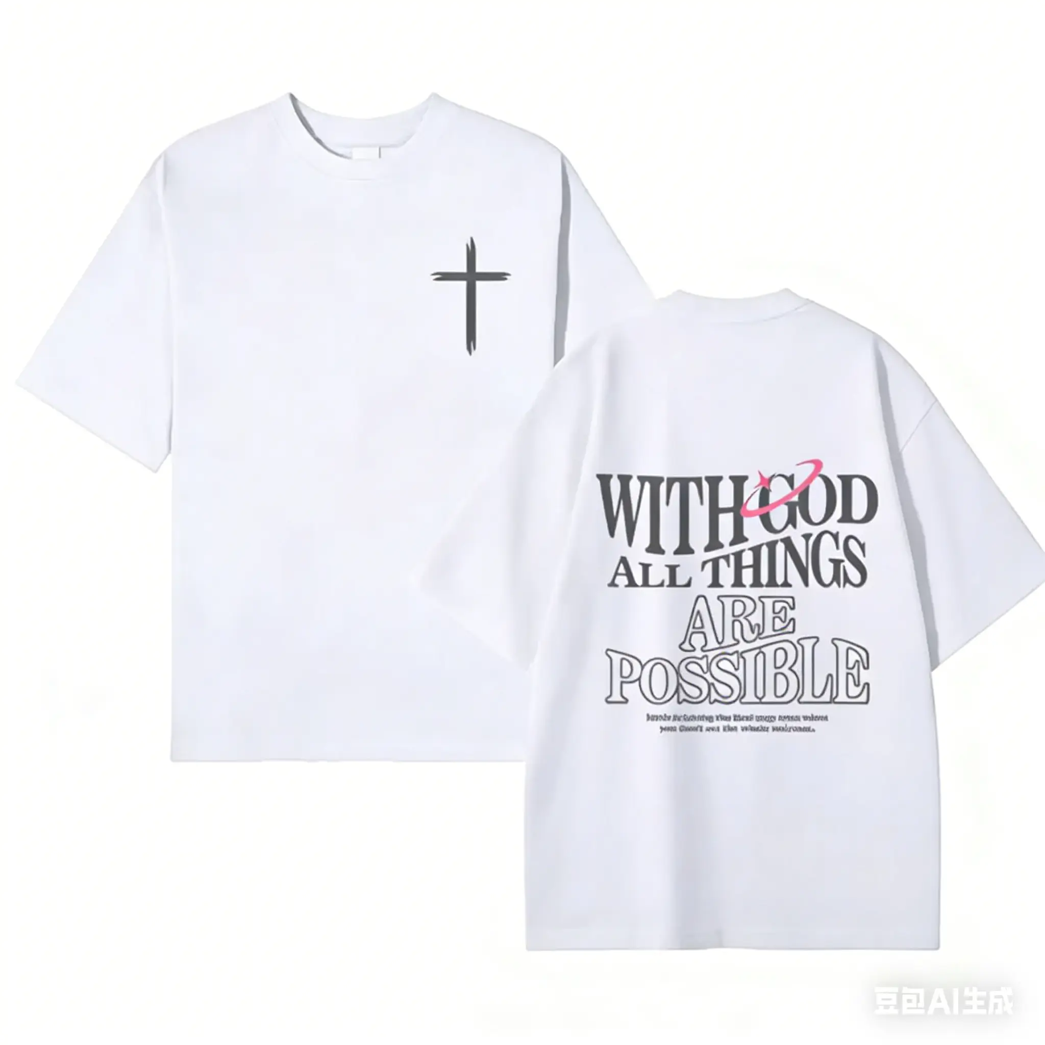 This men’s casual T‑shirt features the powerful and uplifting scripture "With God All Things Are Possible" from Matthew 26:41, printed in clean white lettering on a classic black base.The simple yet meaningful design delivers a strong message of faith, hope, and spiritual encouragement, making it a perfect expression of belief for daily wear and religious occasions.