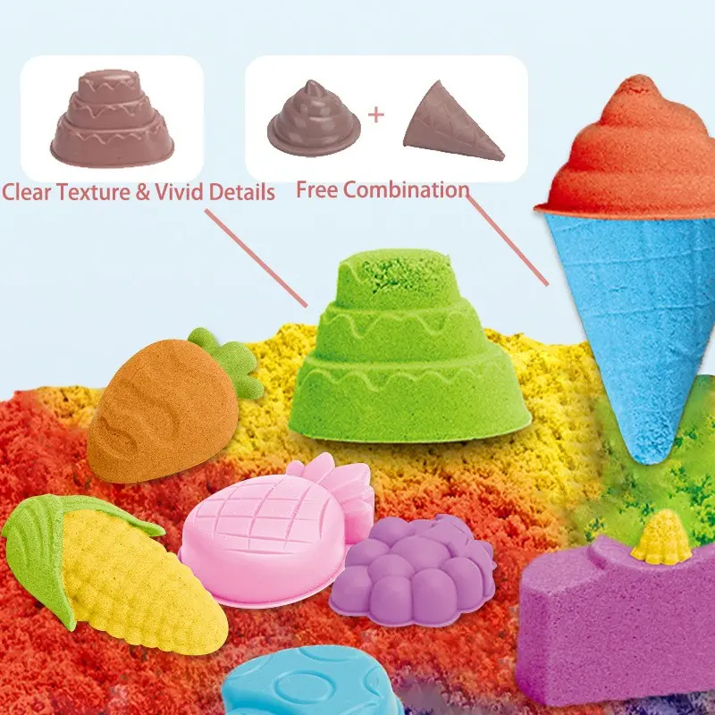 【Sensory Stimulation】: Engage senses with colorful sand and fruit ice cream molds for creative play.