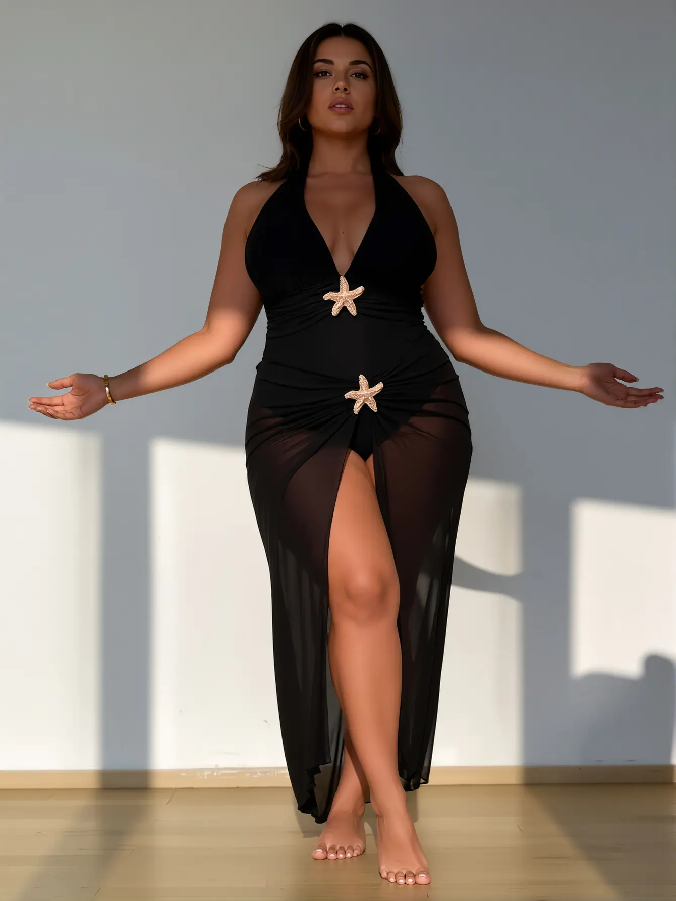 Design: Boho beach suit features a minimalist design, sexy deep V-neck, hanging neck tie, backless, the abdomen has a beautiful ruched design can show the perfect waist curve, lovely metal starfish decoration, high side split beach skirt, the perfect resort style bathing suit