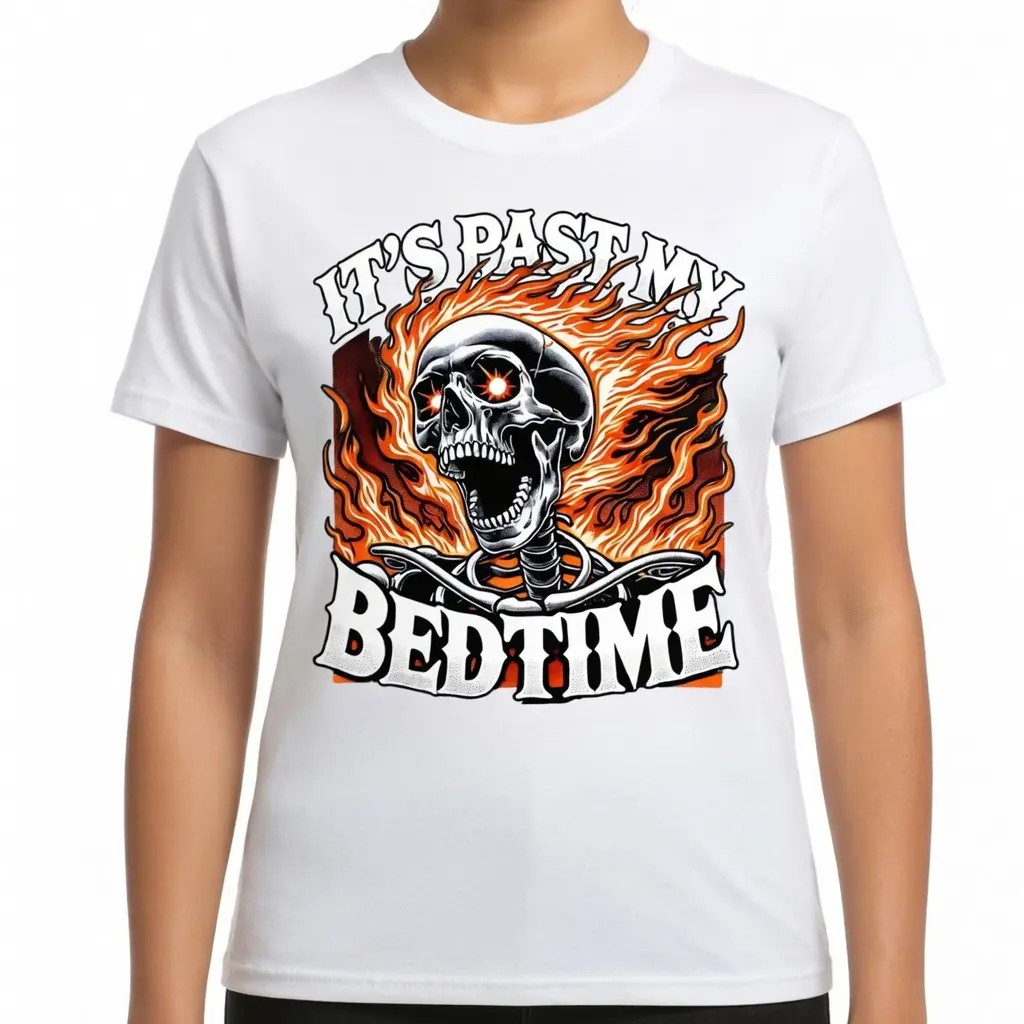 It's Past My Bedtime T-Shirt, Funny Skeleton Meme Flames Graphic Tee, Ironic Tired Humor Short Sleeve Apparel, Aesthetic Embarrassing & Stupid Meme Gift Fashion Top, Viral Trendy Sarcastic Statement Streetwear Shirt