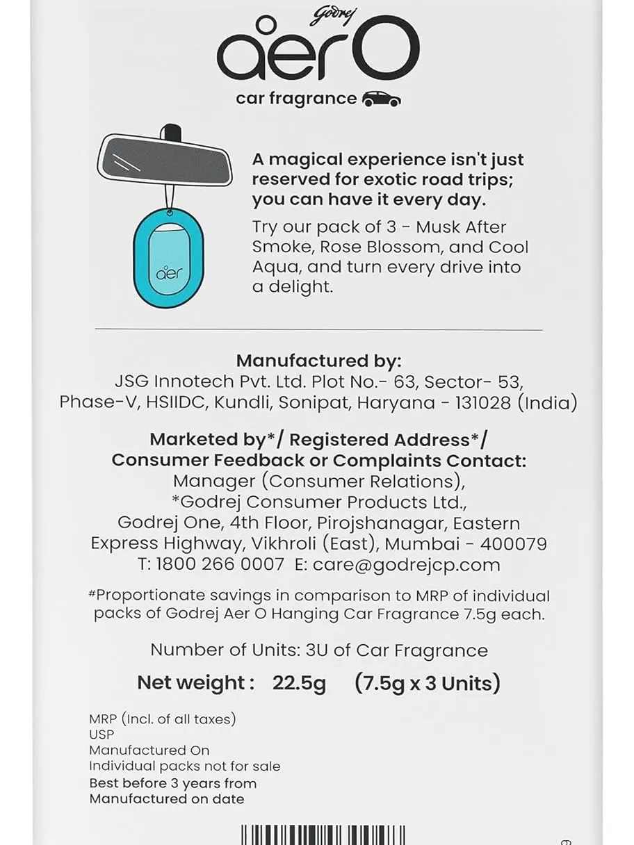 Say hello to the all-new Godrej aer O: your car's new BFF! This quirky, fun hanging car freshener boasts a sleek and aesthetic design that is sure to make heads turn. It's unique membrane technology keeps your ride smelling fresh for up to 30 days. And guess what? The built-in end of life indicator lets you know when it's time for a fragrant farewell. Prepare for a scentsational journey with Godrej aer-o's irresistible range of great fragrances. Buckle up and let the good times roll! 3 exciting fragrances - Cool Aqua, Rose Blossom, Musk After Smoke.