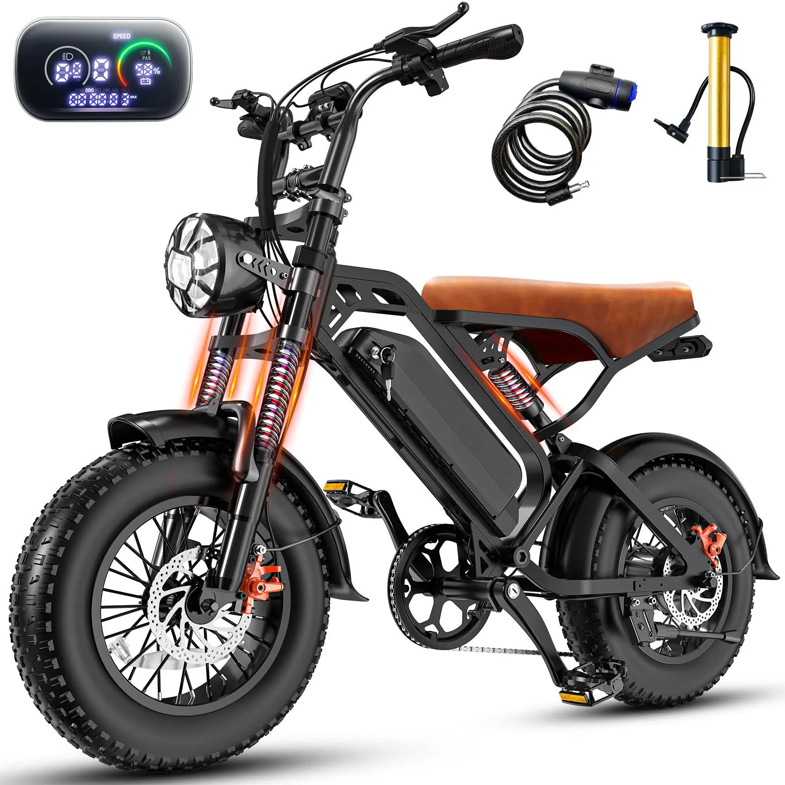 ️【Enhanced Safety & Comfort】:Features a powerful dual front fork suspension and a seat suspension system to absorb shocks, ensuring a safe and comfortable ride even on bumpy roads. The front/rear mechanical disc brakes deliver fast, powerful stopping power in all conditions.