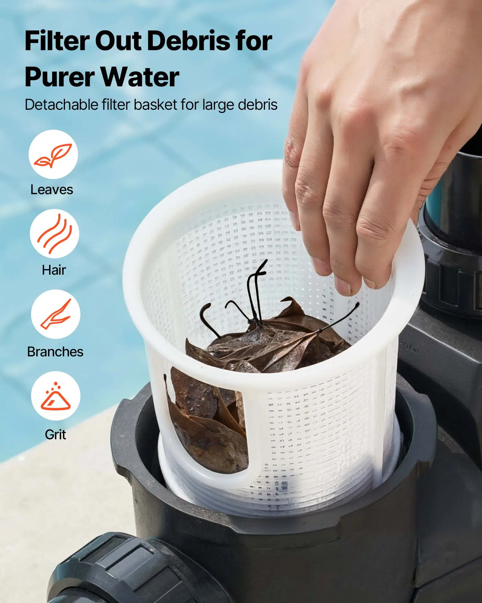 Detachable Filter Basket: The variable speed pool pump includes a filter basket that captures leaves, hair, branches, and sand to avoid clogging while making cleaning fast and effortless