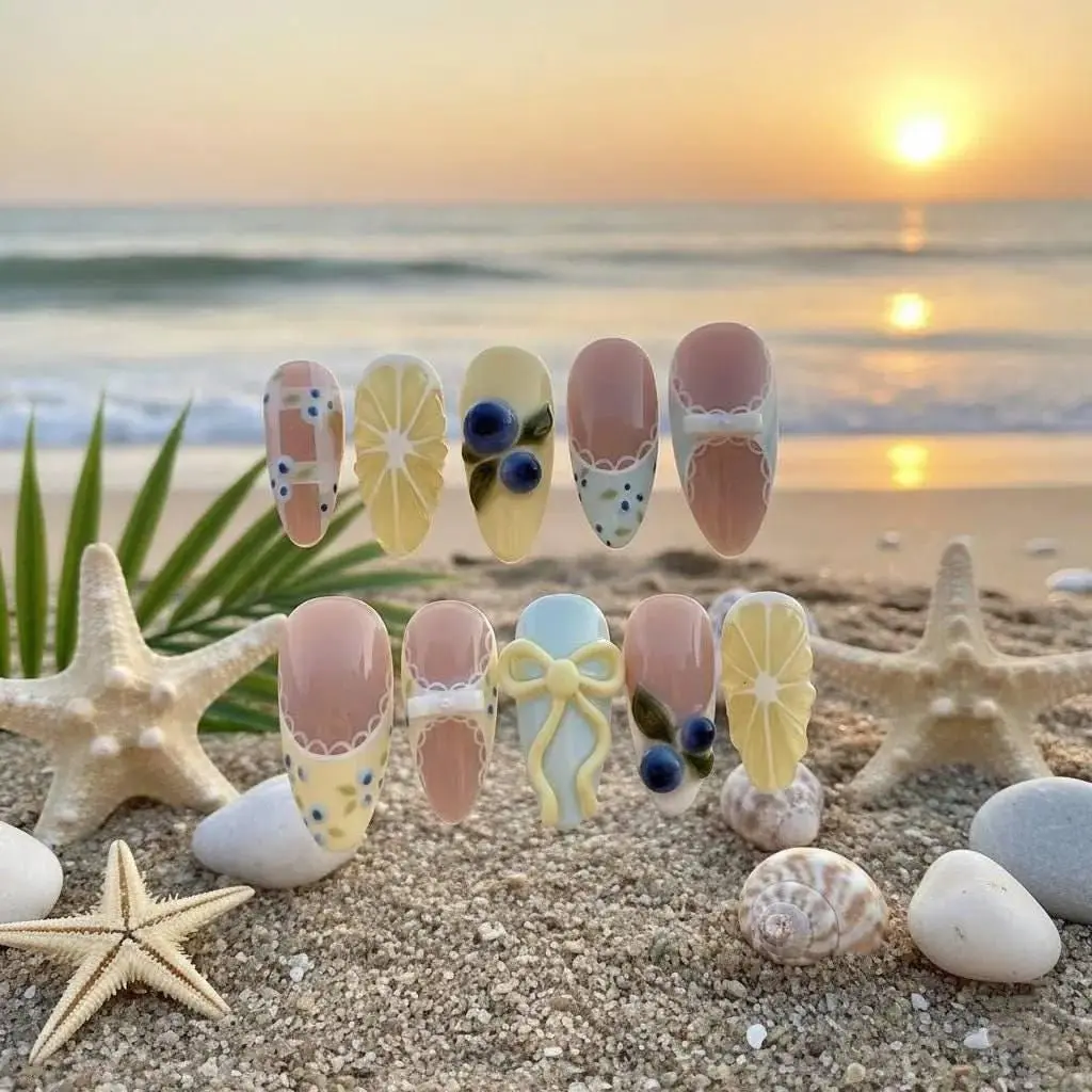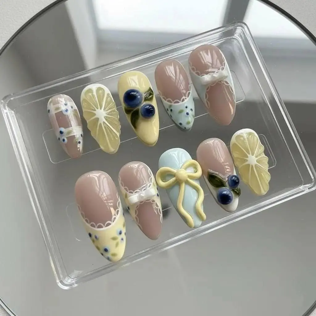 3D Lemon Blueberry Press On Nails: Cottagecore Bow Fruit Nail Art