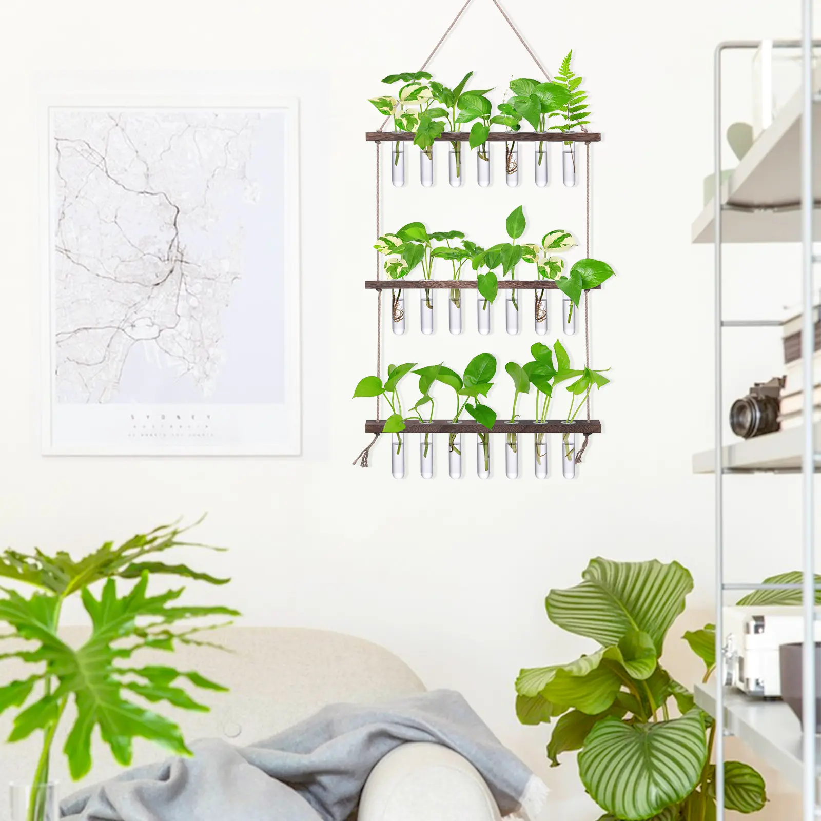 Transform your space with this 3-tier glass test tube planter. Perfect for renters, it offers a stylish way to display plants indoors. The planter measures 15.7" wide, making it a versatile addition to any room. Hang it on the wall to save floor space and add a touch of greenery.