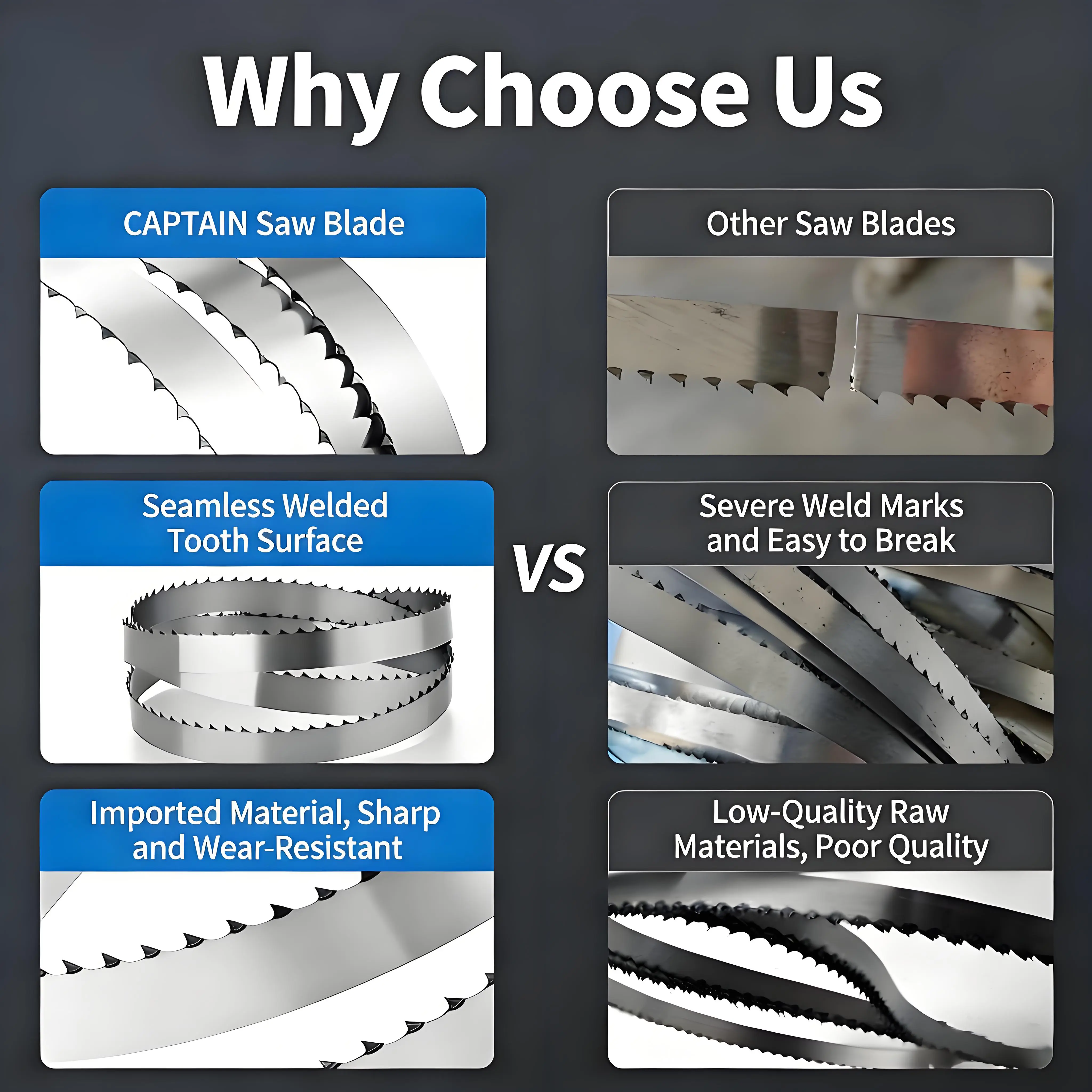 CAPTAIN Custom M42 Bimetal Band Saw Blades with standard length 3505mm are professional industrial-grade cutting tools designed for heavy‑duty applications. Made of high‑speed M42 HSS material and adopting advanced bimetal technology, these blades feature excellent hardness, toughness and wear resistance, ensuring stable and efficient cutting performance.