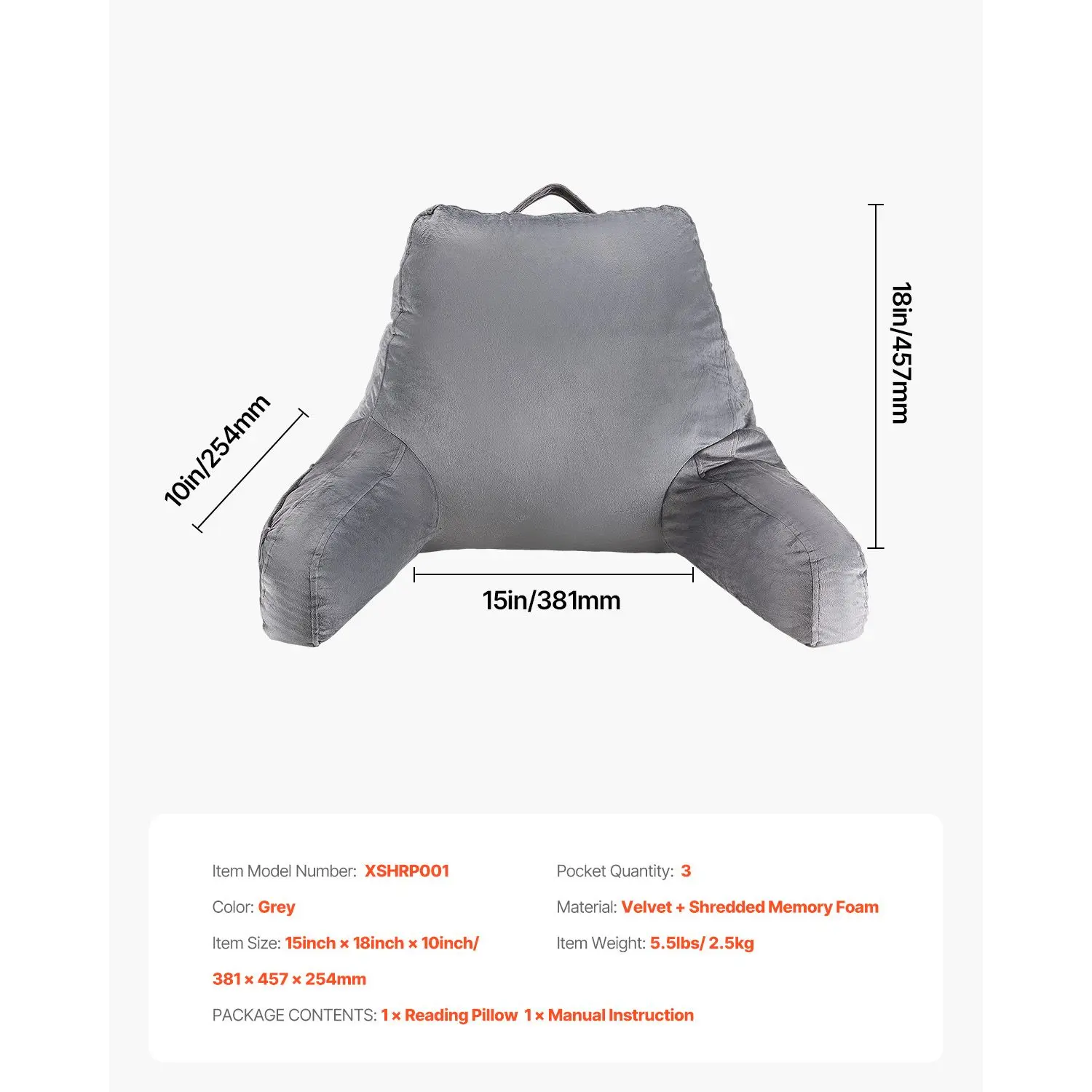 Reading Pillow, Standard Size Bed Pillow with Shredded Memory Foam, Back Pillow with 3 Pockets and Washable Short Velvet Cloth, Top with Handle, for Watching TV, Reading, Gaming, Resting, Grey