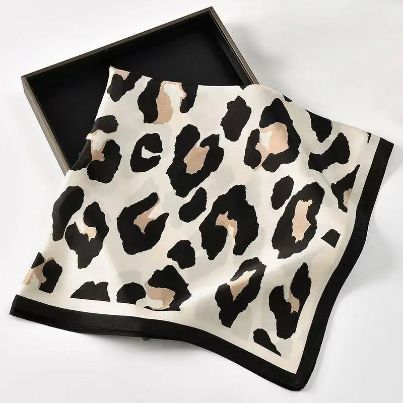 Women’s imitation silk square scarf with an elegant leopard print design; women’s accessory; genuine silk satin headscarf; versatile scarf; a fashionable essential piece suitable for elegant dates, party gifts, commuting, and evening date accessories; wom