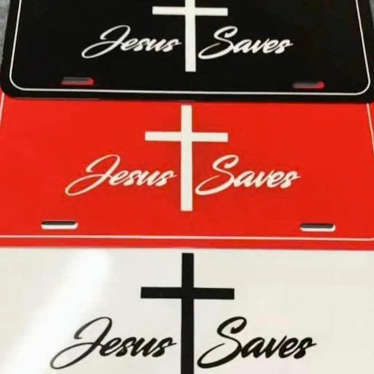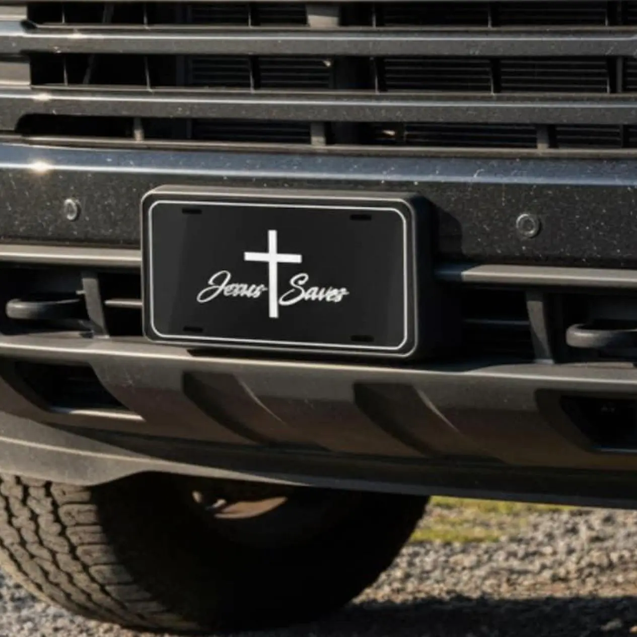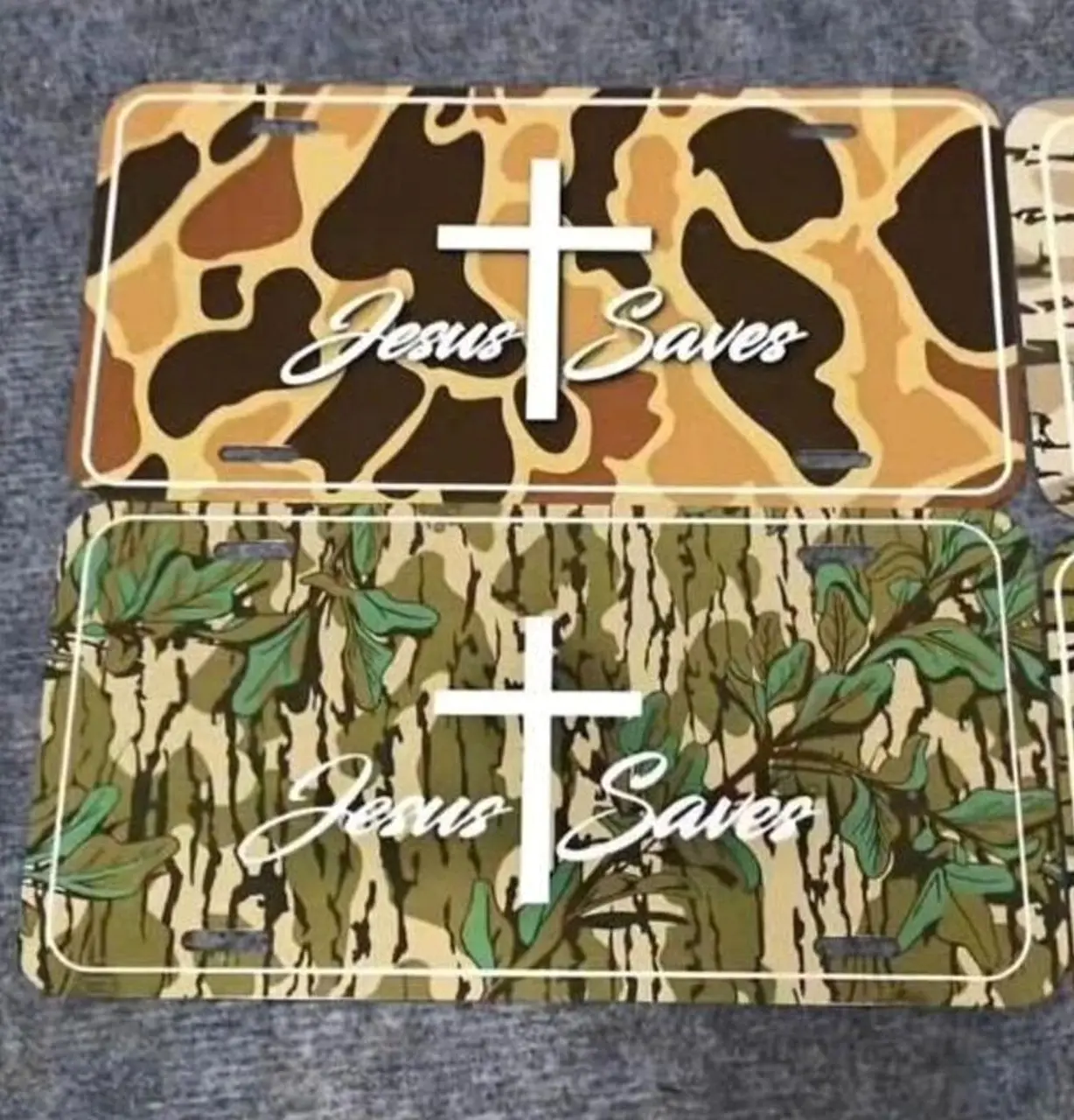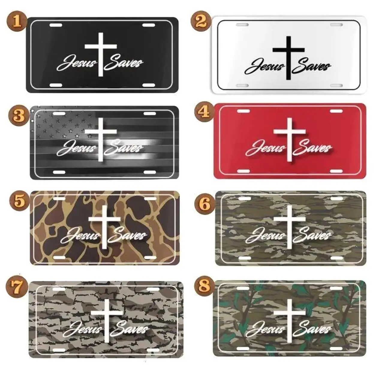 Jesus Saves License Plate – Christian Cross Aluminum Vanity Car Tag with Camo & Solid Color Options
