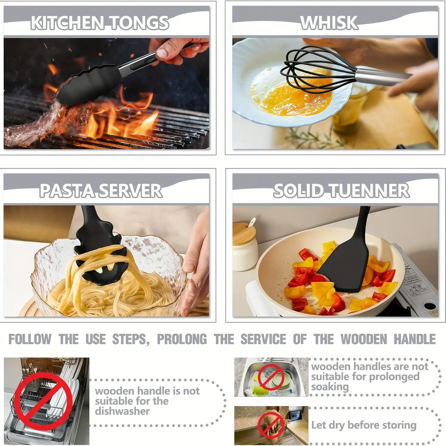 34PCS Silicone Kitchen Utensils Set – Heat Resistant Cooking Tools with Wooden Handles & Holder, Nonstick Safe Set for Nonstick Cookware, Black Wooden Handles Kitchen Gadgets Tools Set Father Gift