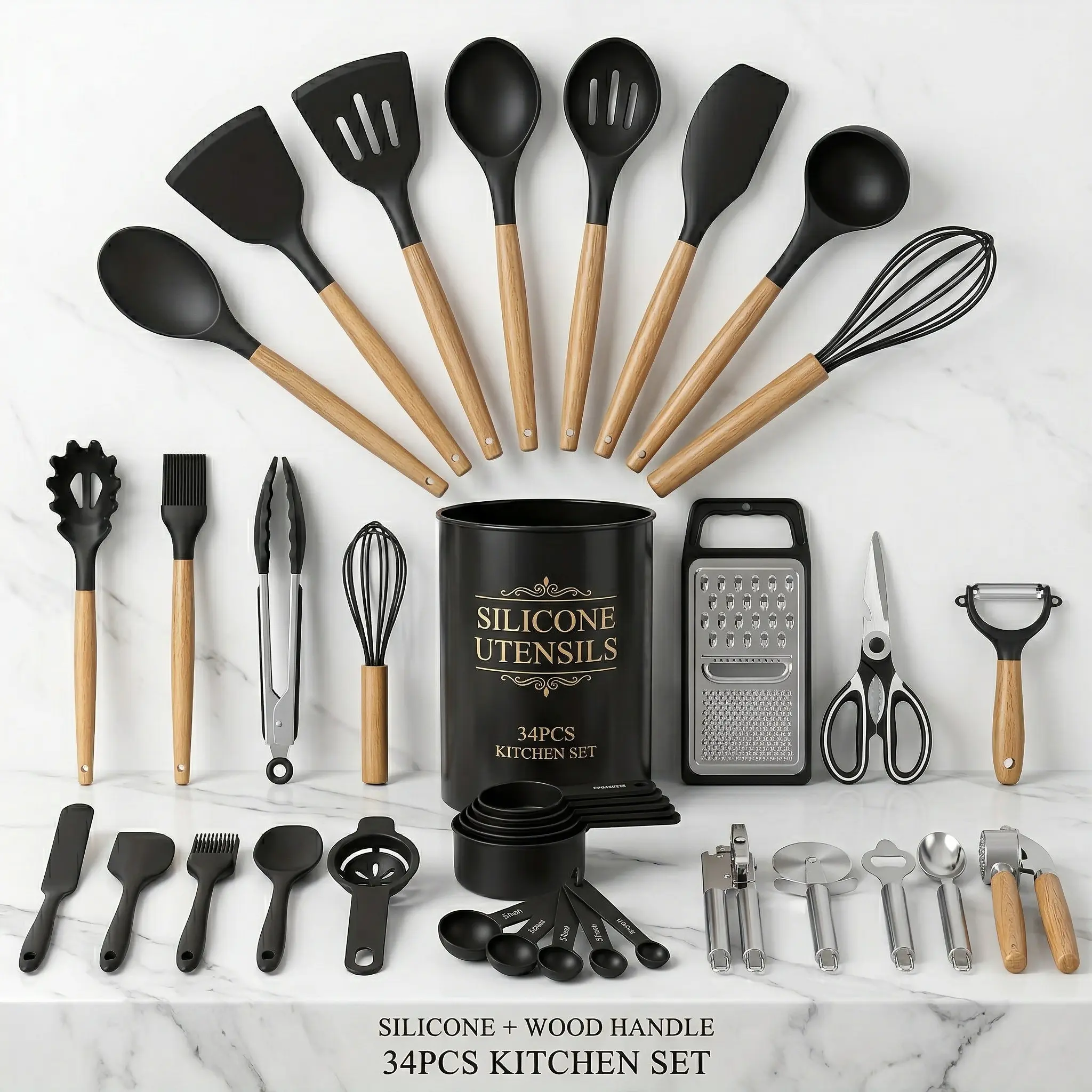 Kitchen Utensils Set- 34pcs Silicone Cooking Utensils with Holder, Heat Resistant Kitchen Utensil Spatula Set for Nonstick Cookware, Black Wooden Handles Kitchen Gadgets Tools Set Father Gift