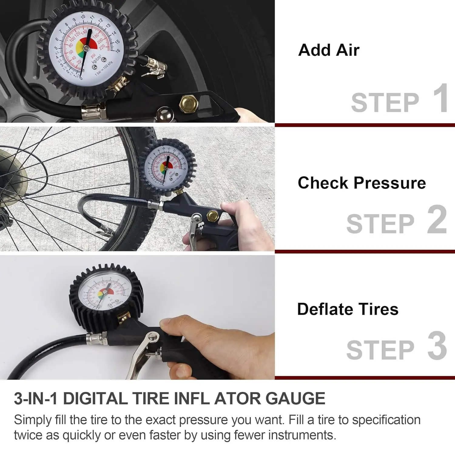 Tire Inflator with Gauge: Tire inflator with ventilation valve and pressure gauge, air blow gun are all combined in one easy to use unit.Clear and easy to read display dial with 0-220 psi gauge (No more than 140 PSI is recommended).Heavy duty metal construction that is corrosion-resistant and very durable.Multipurpose: PSI measurements can be clearly displayed even when not connected to the air compressor.The vent valve can release excess air without removing the chuck of the tire stem.Standard Blow Gun with Nozzles: All metal construction standard air blow gun with 1 nozzles and 2 inflation needles, all-purpose use for bicycles, air mattresses, balls, etc.Great Air Compressor Kit: Applicable to all you need to start your project.The inflator can be connected to any 1/4 Inch NPT air compressor output to quickly inject optimal pressure to the tire.Set Contents: 1 air blow gun and 2 nozzles, 1 Filling gun with valve connector hose, 7 adaptors plus adaptor attachment.