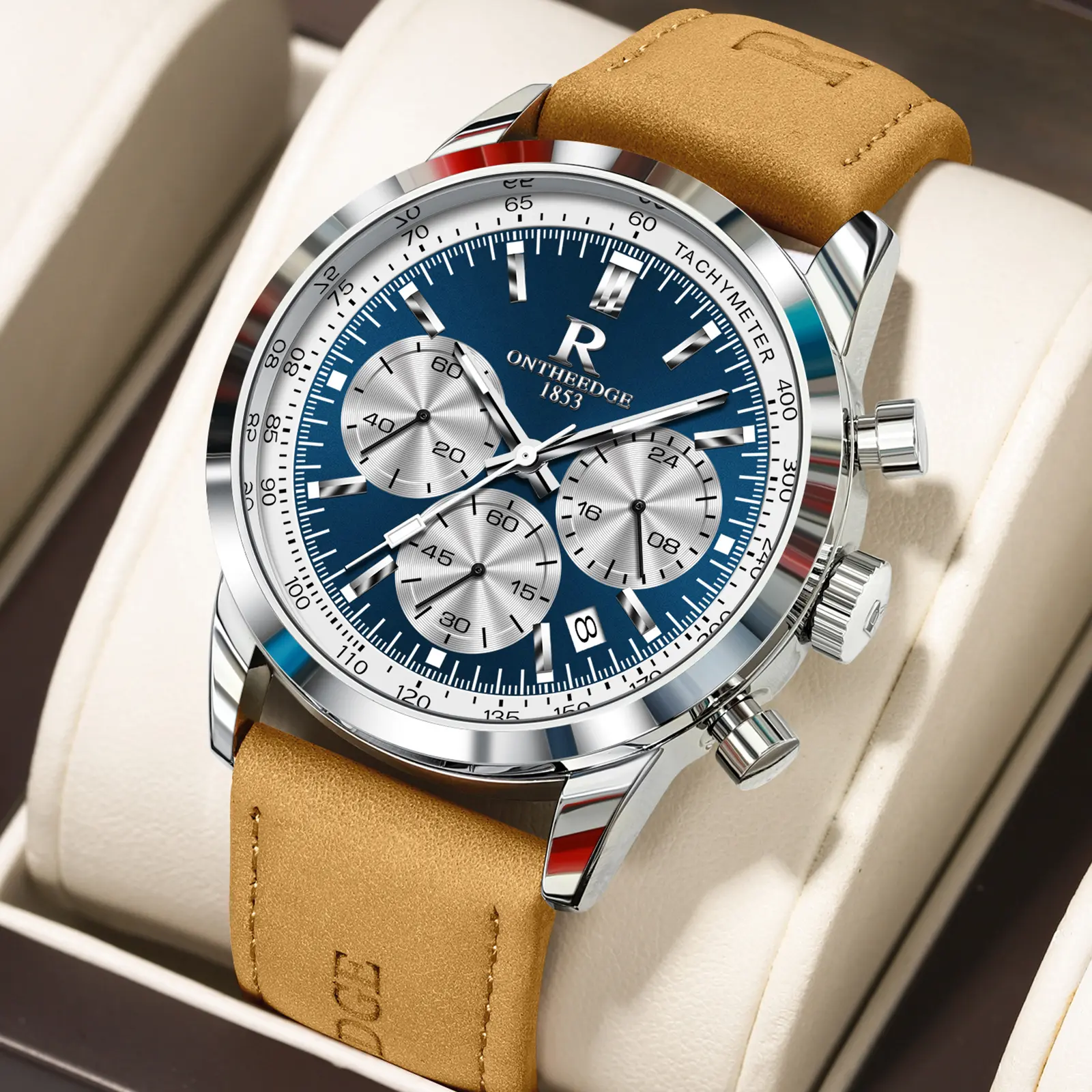 Men's Luxury Blue Dial Chronograph Quartz Watch - Stainless Steel Wristwatch with Tachymeter, Date Display, Multi-Function Subdials, Elegant Business Sport Dress Watch, Perfect Gift for Husband Dad Boyfriend