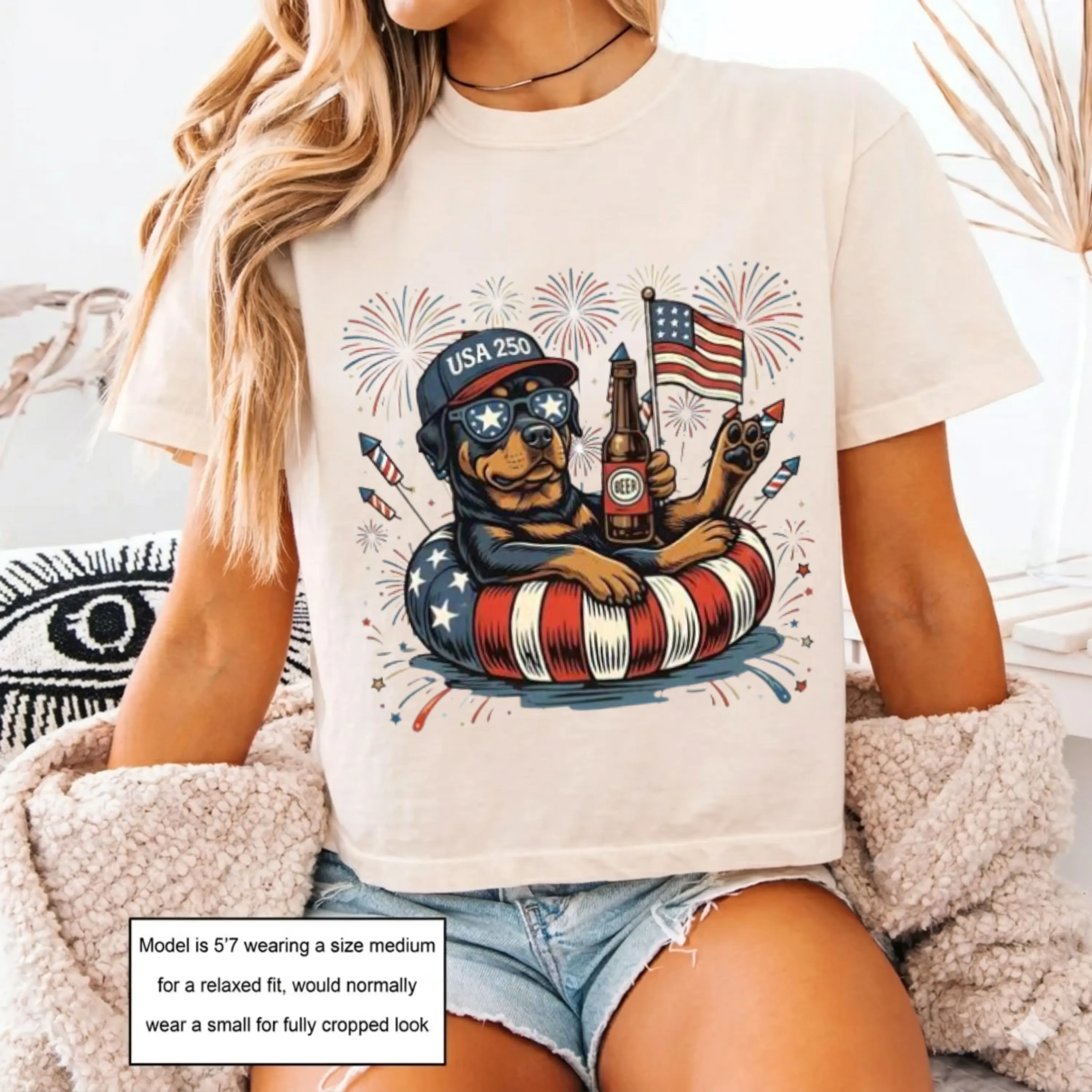 USA 250 Boxy Tee Patriotic Rottweiler Dog Graphic Tee Cropped Shirt Women’s Retro Style 90s Dog Lover Gift Independence Day Tee American Flag Design