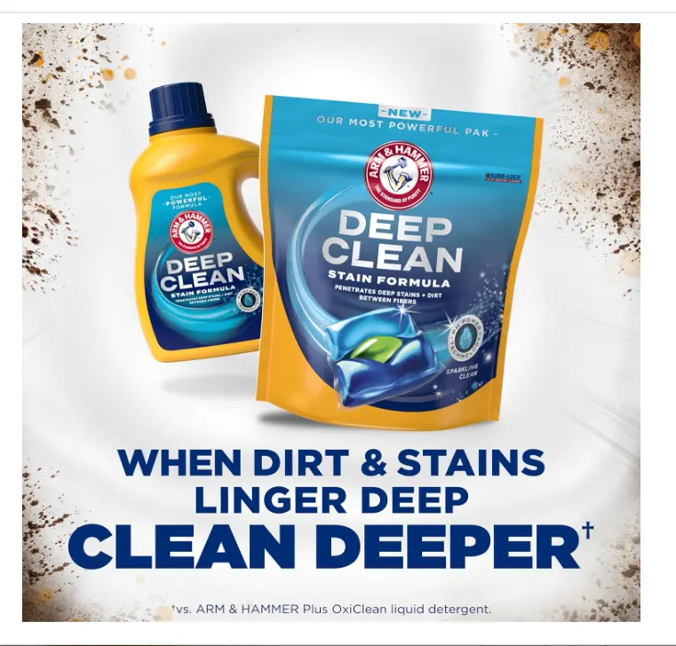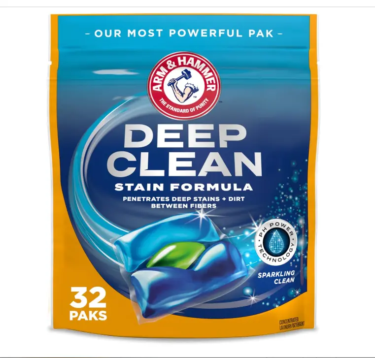 ·Stain-fighting detergent paks: 32 count pouch of ARM & HAMMER Deep Clean Stain Formula Laundry Detergent Power Paks in a Sparkling Clean Scent