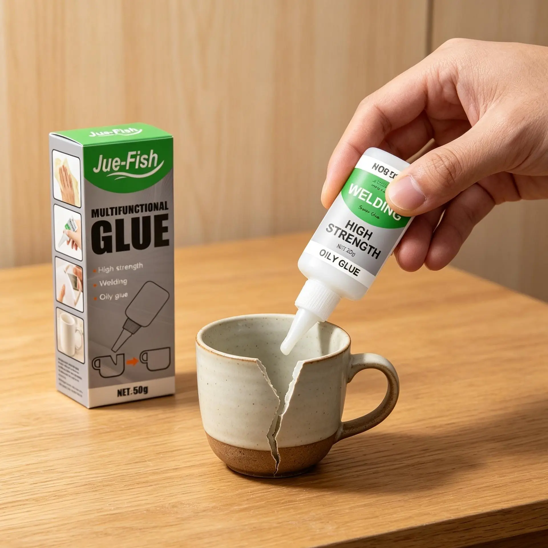 Our multifunctional ceramic waterproof transparent glue (50g) contains polyvinyl alcohol and white latex. It can quickly solidify, has strong adhesion, and offers good waterproof properties. Its usage is very simple: clean the surface of dust. Apply glue to the bonding surfaces. Press the glue in place for about 30 seconds. Let it sit for a while to solidify; the longer it sits, the better the effect. It is also resistant to high temperatures, cures quickly, and has a wide range of applications