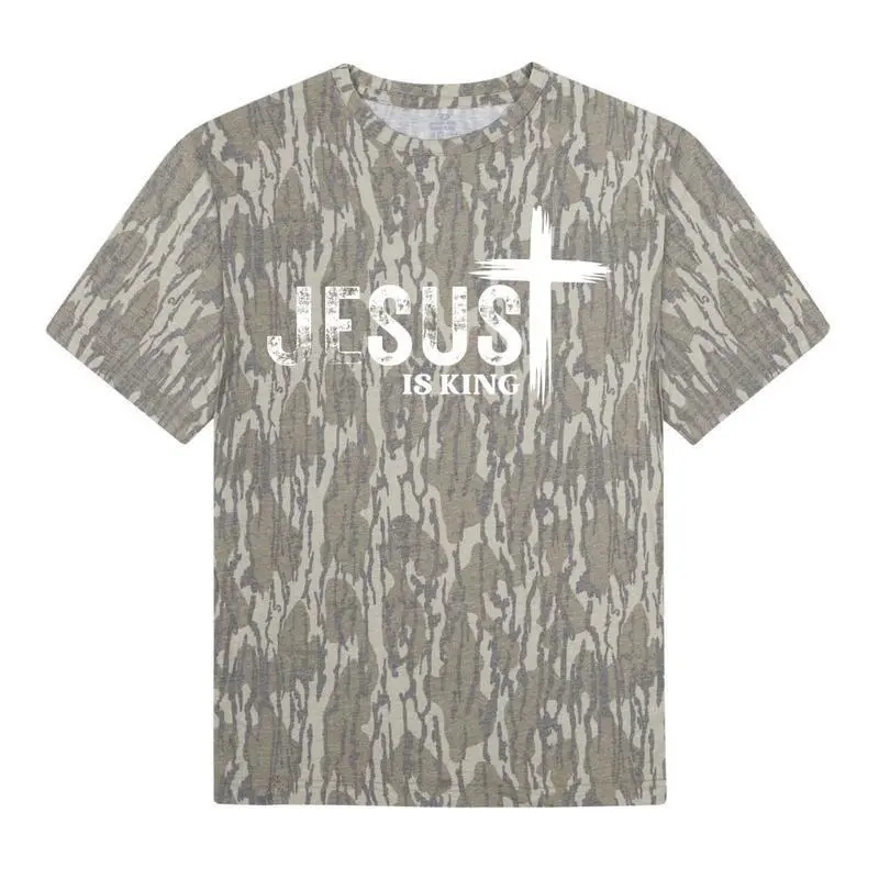 5. Jesus Is King Graphic Mossy Oak Bottomland Tee, Mossy Oak Washed Out Jesus Is King Camo T-shirt, Mossy Oak Jesus White Cross Camo Shirt