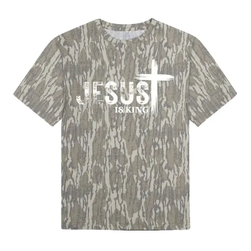 Jesus Is King Graphic Mossy Oak Bottomland Tee, Mossy Oak Washed Out Jesus Is King Camo T-shirt, Mossy Oak Jesus White Cross Camo Shirt
