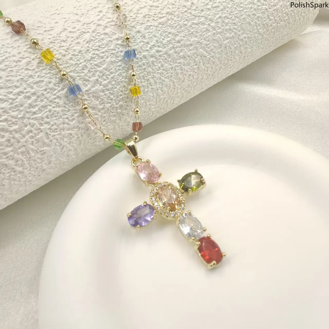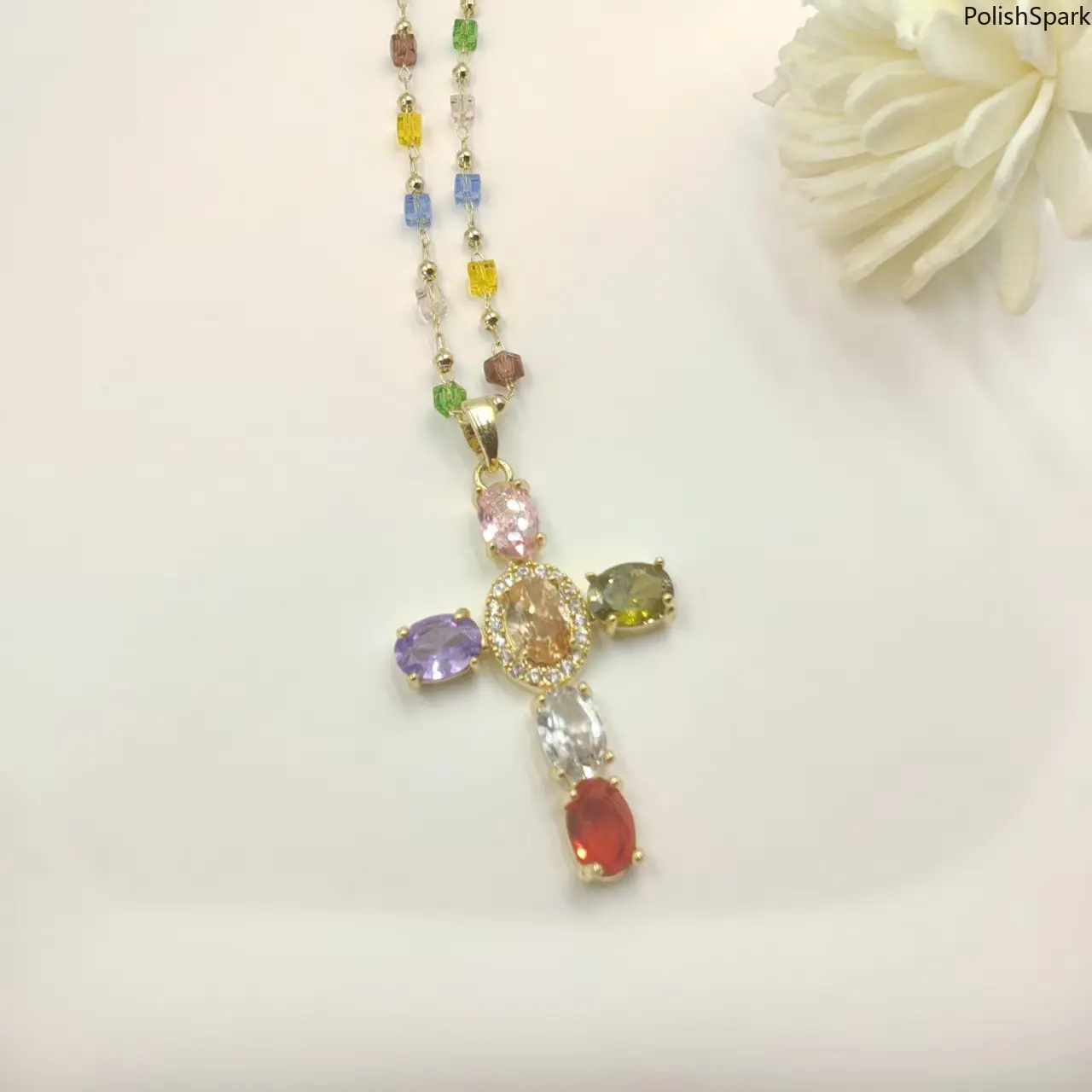 1. Stunning Multi-Color Zircon Cross PendantThe centerpiece of this necklace is a beautifully crafted cross pendant, inlaid with 6 vibrant oval cubic zirconia stones (pink, purple, green, clear, red, champagne) and a halo of sparkling small zircons around the center stone. The exquisite inlay process ensures the stones are secure and shiny, delivering a brilliant, eye-catching sparkle in any light.