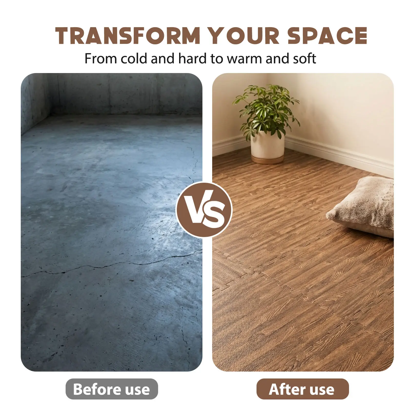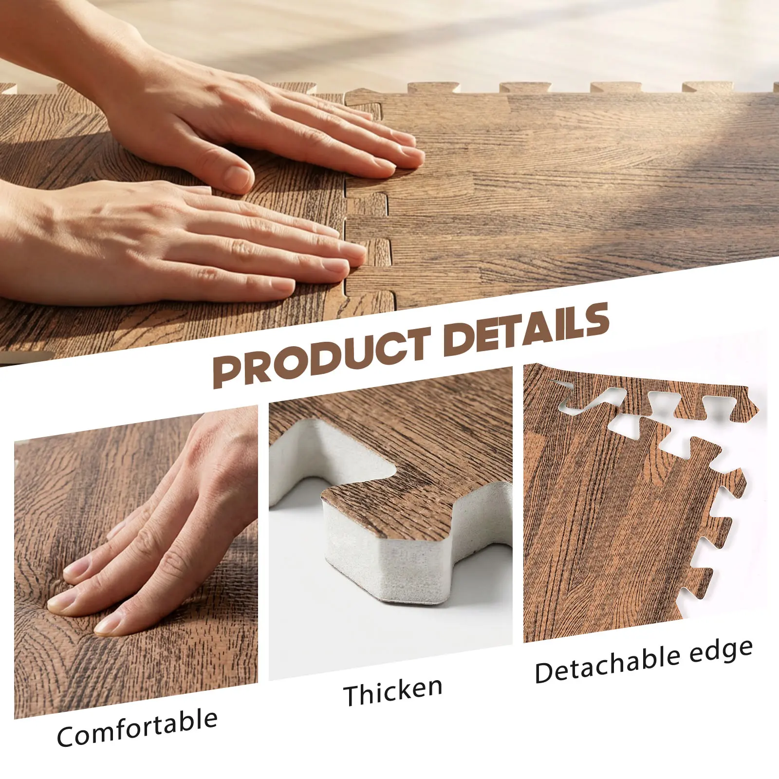DURABLE DOUBLE-SIDED DESIGN: Interlocking mat features strong EVA foam construction, helps protect floors from scratches, dents, pressure marks, while providing soft underfoot comfort in daily life; Each tile has aesthetic wood print on 1 side & honeycomb pattern on another for shock-absorption effect, offering both durability & flexibility in layout