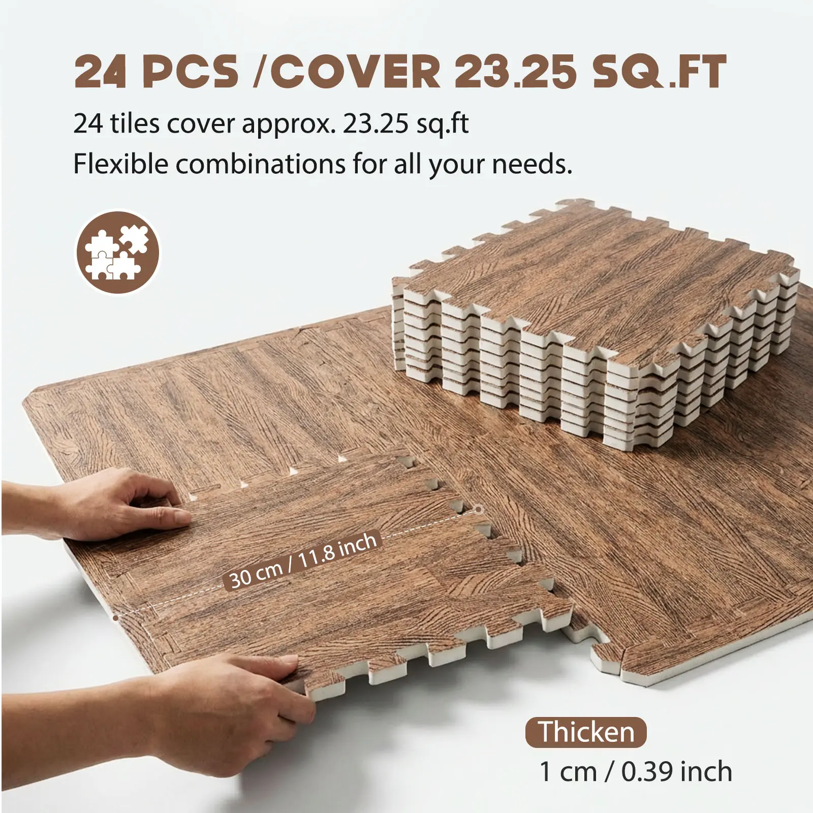 24 TILES COVER 23.25 SQFT: Each floor mat tile is 11.8"x11.8" in size, they are designed to be assembled and customized easily, ideal for coverage in multiple spaces; With 0.39" thickness, the interlocking mat provides a comfortable & innovative home flooring solution