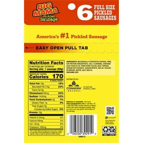 Penrose big mama pickled sausages contain 160 calories with zero grams trans fat per serving. This pack contains six 2.4 ounces pickled sausages.