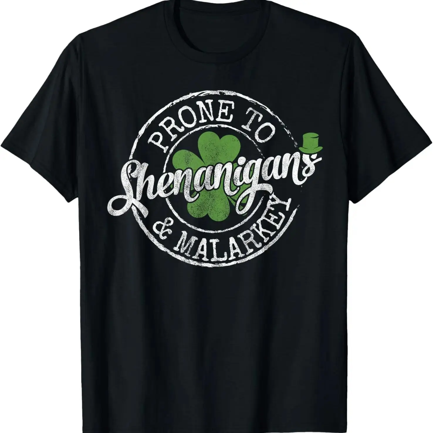 This St Patrick’s Day T‑shirt features the playful and witty slogan "Prone to Shenanigans & Malarkey" paired with cheerful clover graphics, full of lighthearted humor and festive Irish spirit.The fun and lively design perfectly captures the joyful, mischievous vibe of Saint Patrick’s Day, making it a great choice for anyone ready to celebrate the holiday with humor and personality.