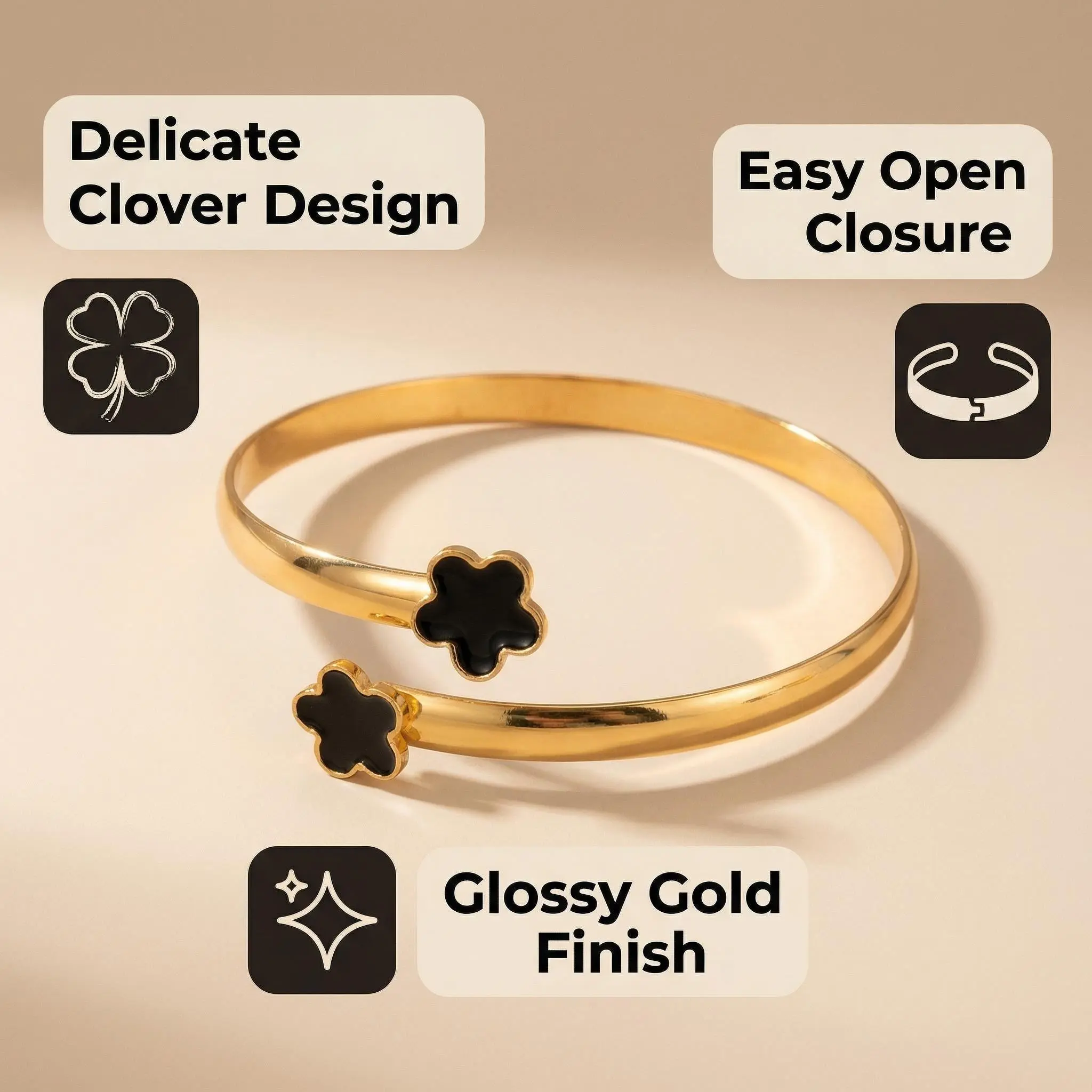Elevate your everyday style with this delicate five-leaf clover charm open bangle bracelet. Designed with an adjustable open cuff, it is extremely easy to wear and remove without struggling. Crafted with shiny metallic material, this bracelet delivers a bright, polished finish that enhances your overall look with a touch of luxury. The lovely five-leaf clover pendant adds a sweet and lucky vibe, available in classic white and black to match different outfits. Perfect for office workers, students, and fashion lovers, it fits daily commute, casual outings, friend gatherings, and shopping trips. Lightweight, comfortable, and versatile, this bracelet is a must-have accessory to make your daily styling more delicate and eye-catching.