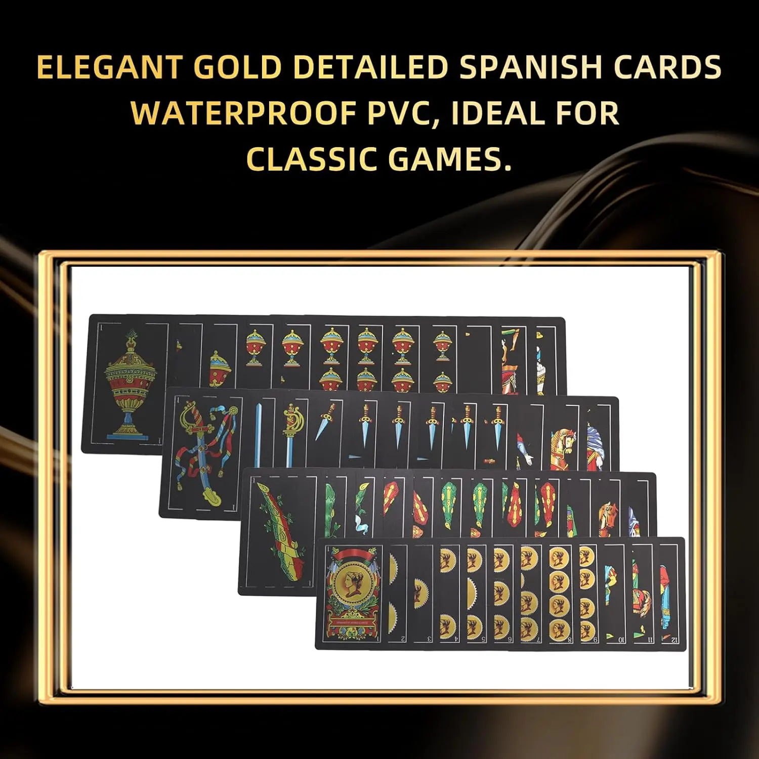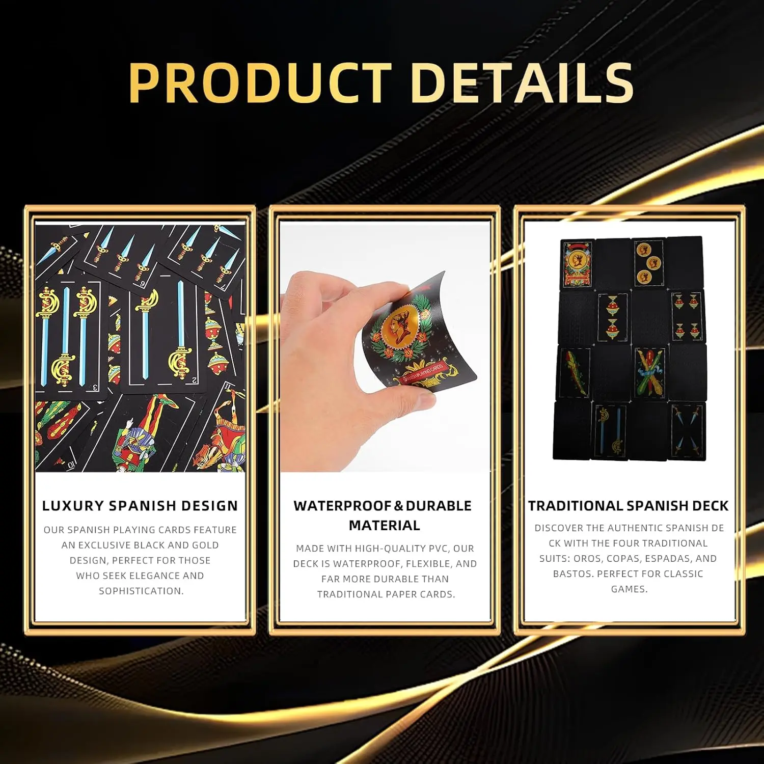 Each Spanish playing card features a sleek black and gold foil finish. This luxurious and eye-catching look is a stunning tribute to traditional cartas españolas. These cards are visually striking and easy to shuffle for smooth, uninterrupted readings.