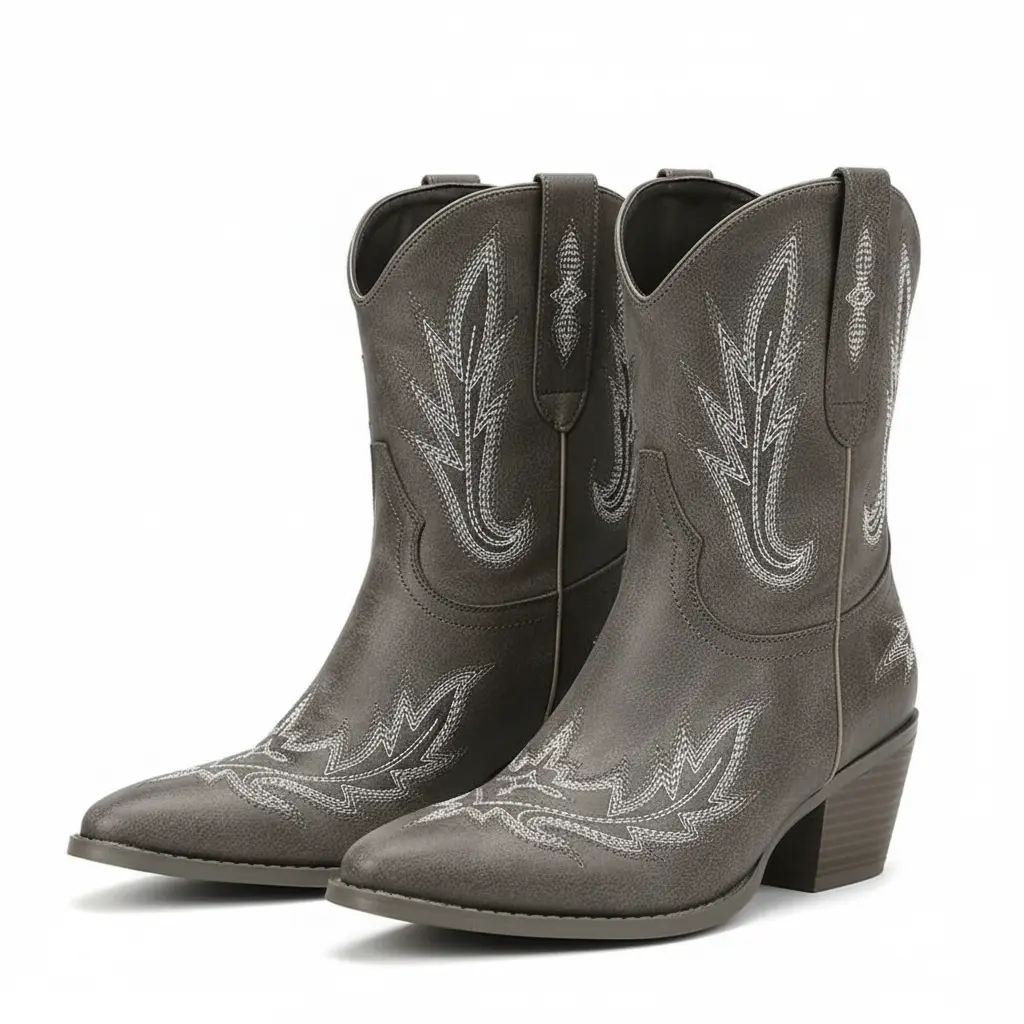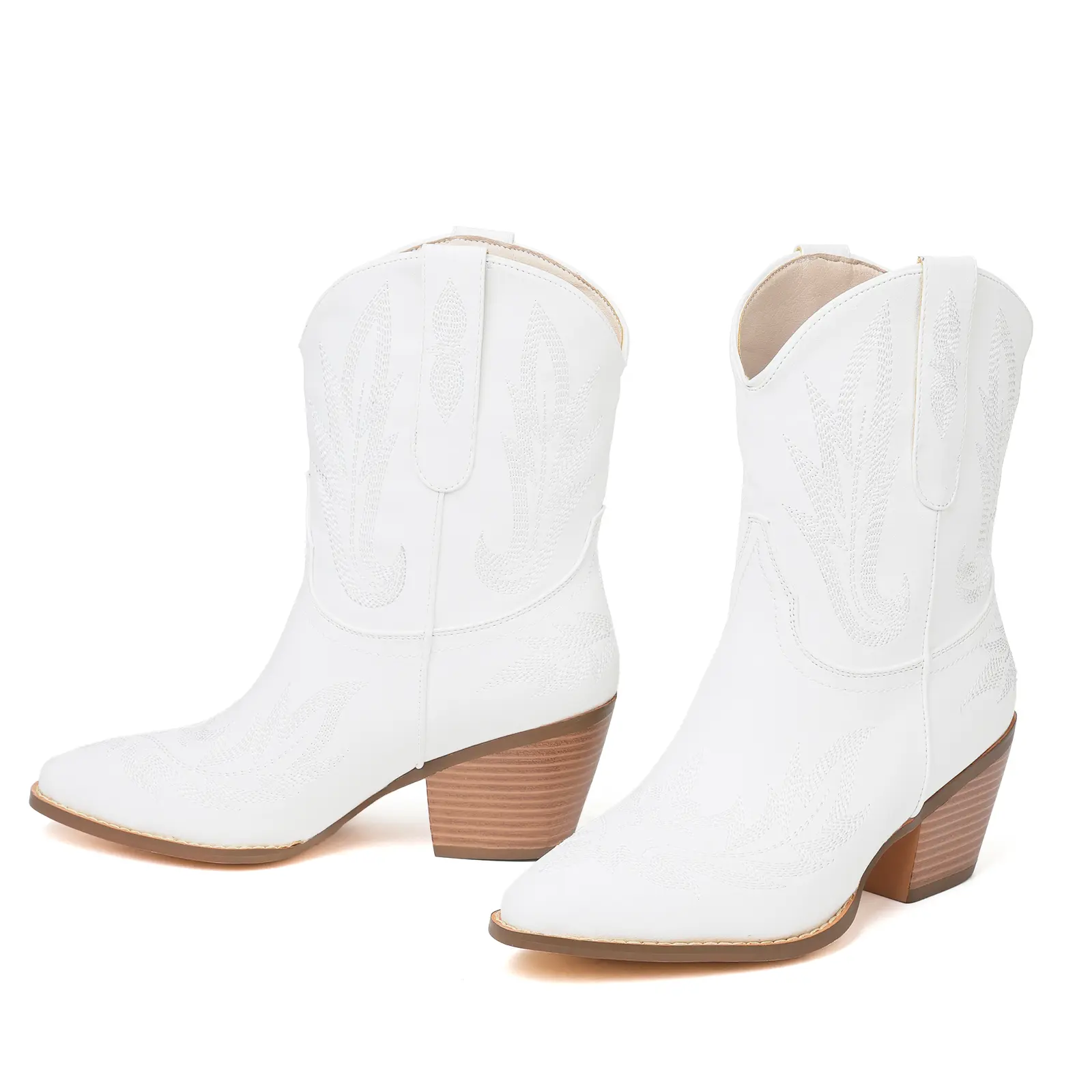 CELNEPHO Women Cowboy Boots Pointed Toe Block Heel Ankle Booties Western Embroidered Design Easy Pull on Tabs Cowgirl Boot Gift Horse Ridding Country Wedding Dress Shoes