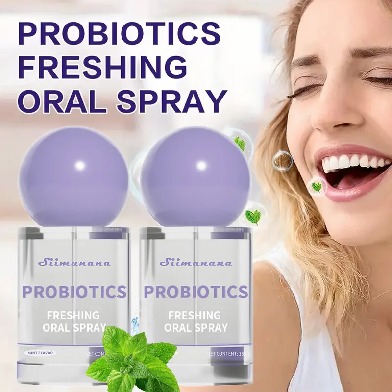 Discover the Ultimate Solution for Fresh Breath and Oral Health: Experience the refreshing benefits of our Probiotic Oral Spray. This 15ml spray contains four patented probiotics (ADP - 1, ET - 66, AP - 32, LR3) to support a balanced oral microbiome, promoting healthier gums and teeth, while freshening your breath throughout the day. Additionally, the formula includes pearlescent powder for a unique, refreshing sensation in your mouth.