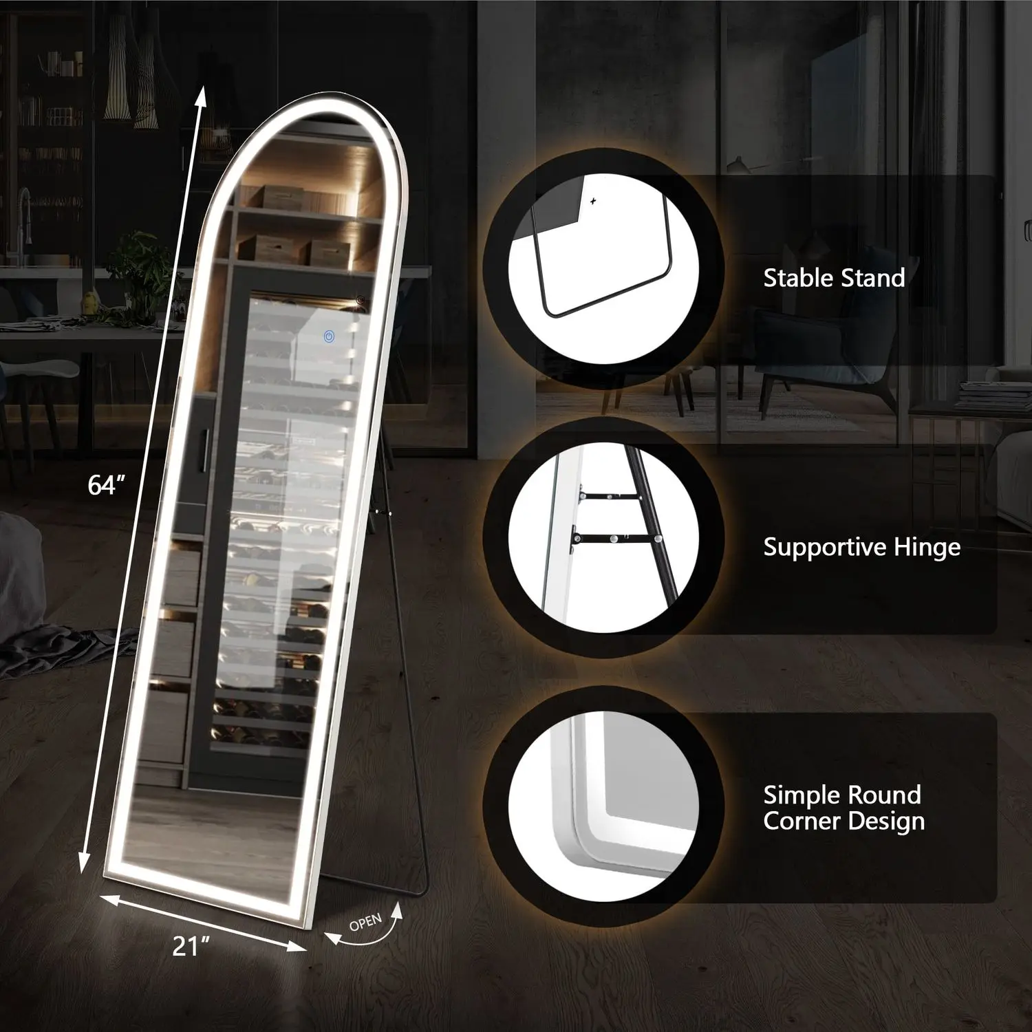 64"x21" LED Arched Full Length Mirror with Aluminum Frame and Polished Glass for Bedroom