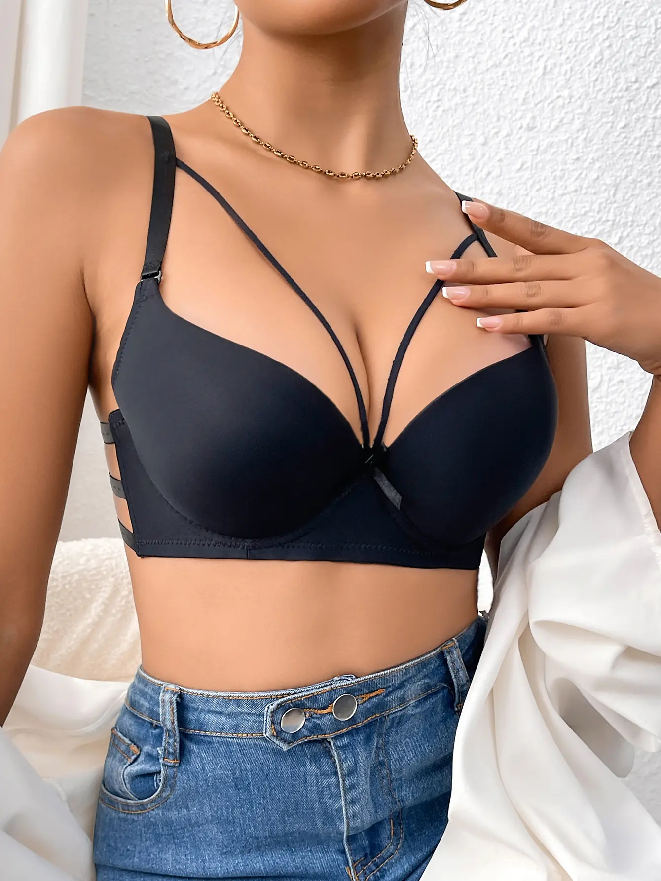 Sexy Push Up Bra for Women, Black Deep V Bralette with Strappy Back Design, Wireless Lace-Up Supportive Bra for Club & Party Outfits