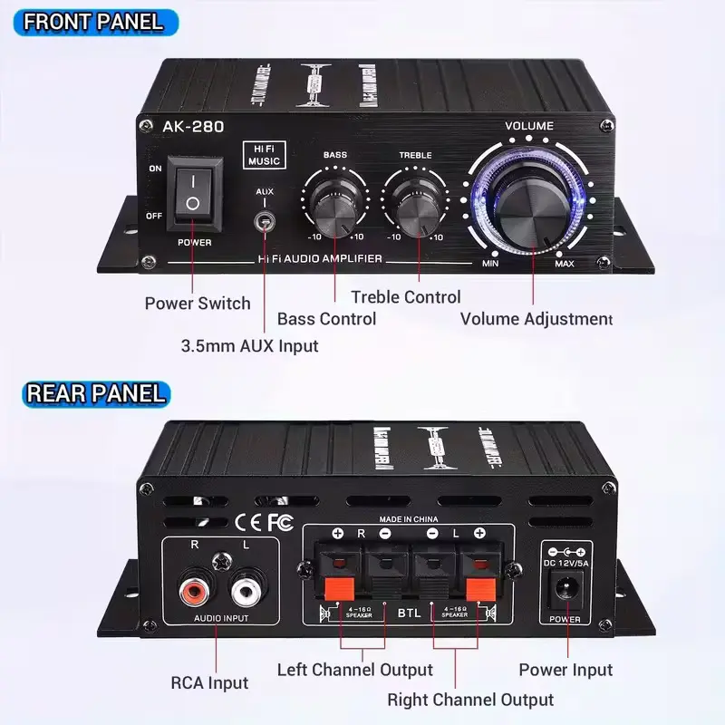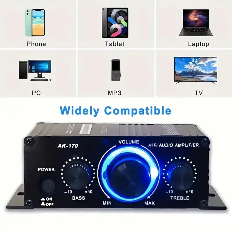 Enhance your audio experience with the AK280 AK170 Mini 2.0-Channel Audio Amplifier. This compact device is perfect for cars, homes, and garages. It features a 2.0-channel receiver speaker amplifier, ideal for music lovers. The amplifier includes bass and treble controls, allowing you to customize your sound.