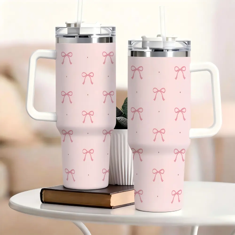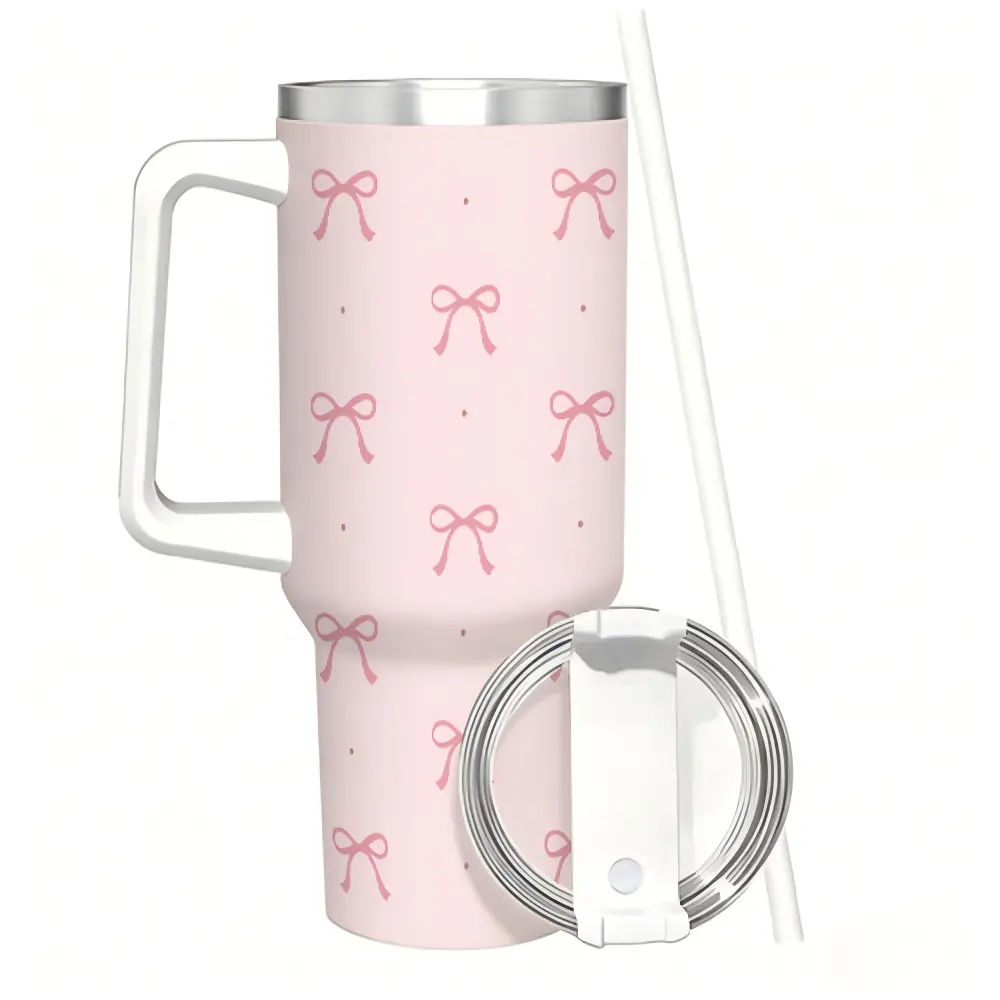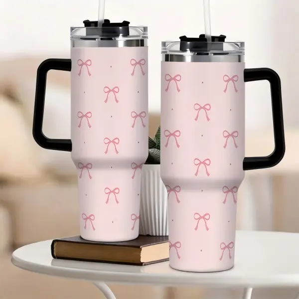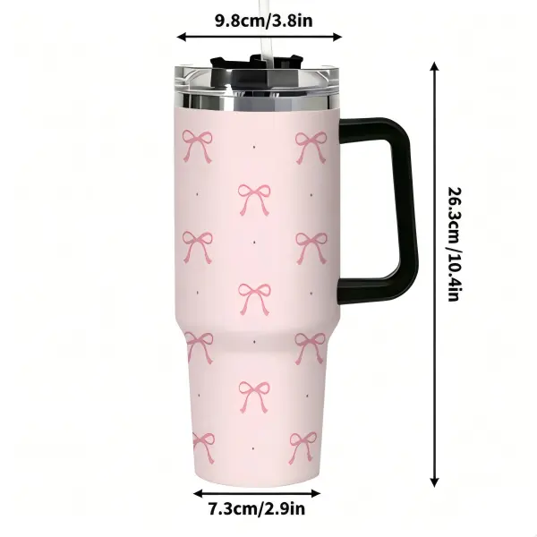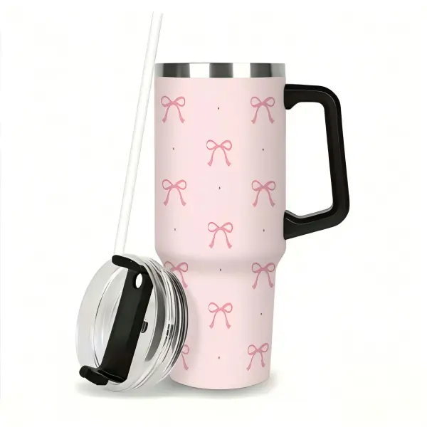 40oz Pink Bow Coquette Tumbler with Handle, Insulated Stainless Steel Travel Cup, Cute Reusable Coffee Mug with Straw & Lid, Gift for Women