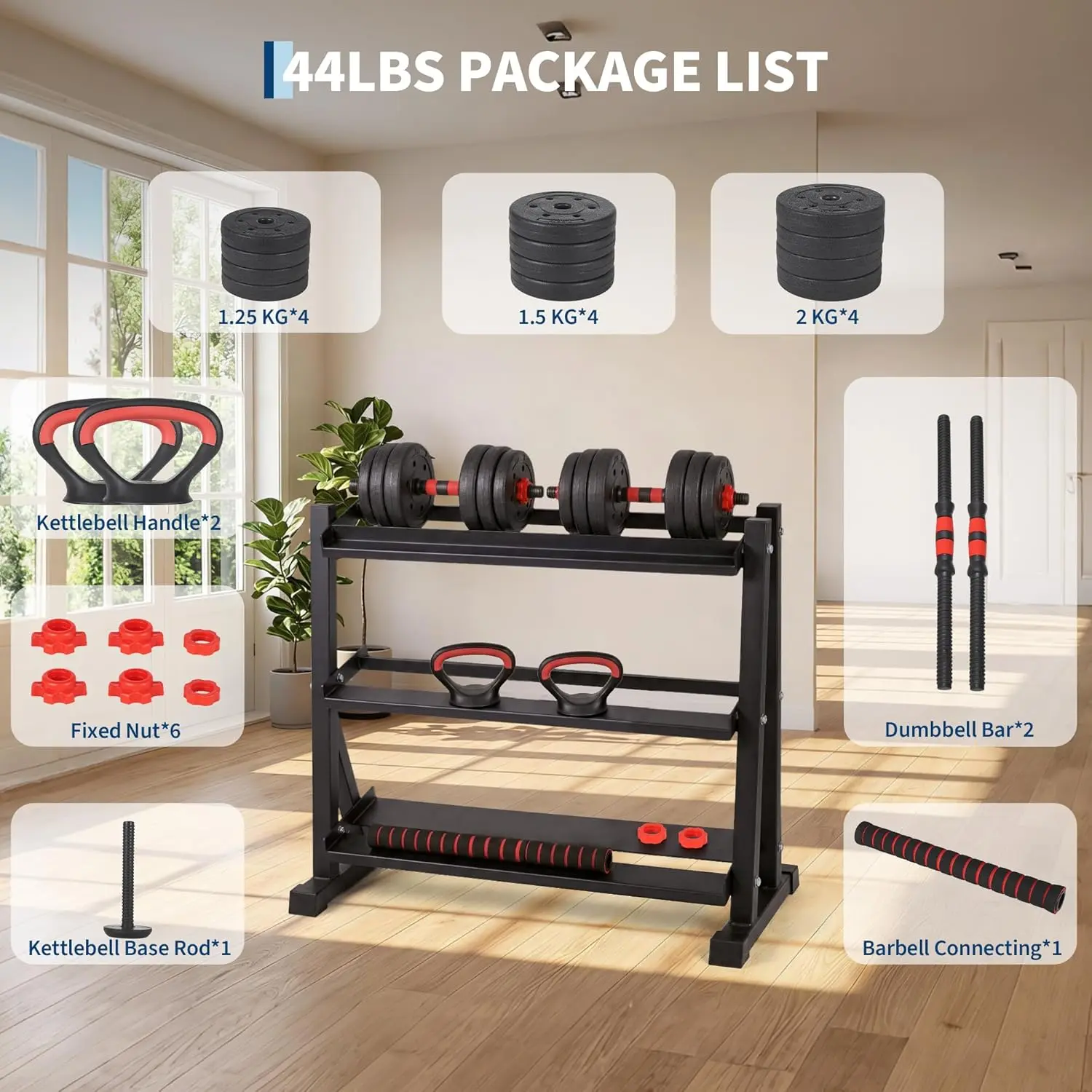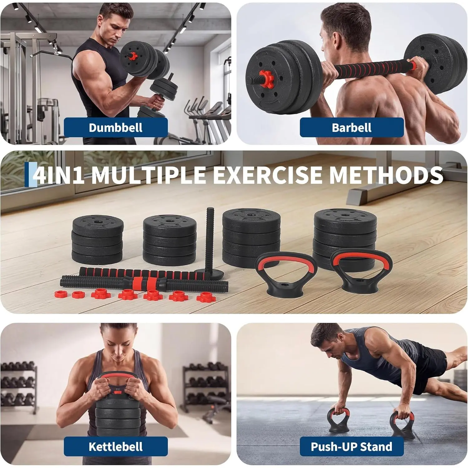 ·1. 4-IN-1 MULTI-FUNCTIONAL HOME GYM KIT:This versatile weight set transforms into dumbbells, barbell, kettlebell, and push-up stand to cover full-body workouts, eliminating the need for multiple bulky fitness tools. Ideal for squats, deadlifts, bench press, shoulder presses, kettlebell swings, and push-ups, it’s perfect for home gyms, apartments, and small spaces where storage is limited. Enjoy a complete strength training routine without expensive gym memberships or cluttered equipment.