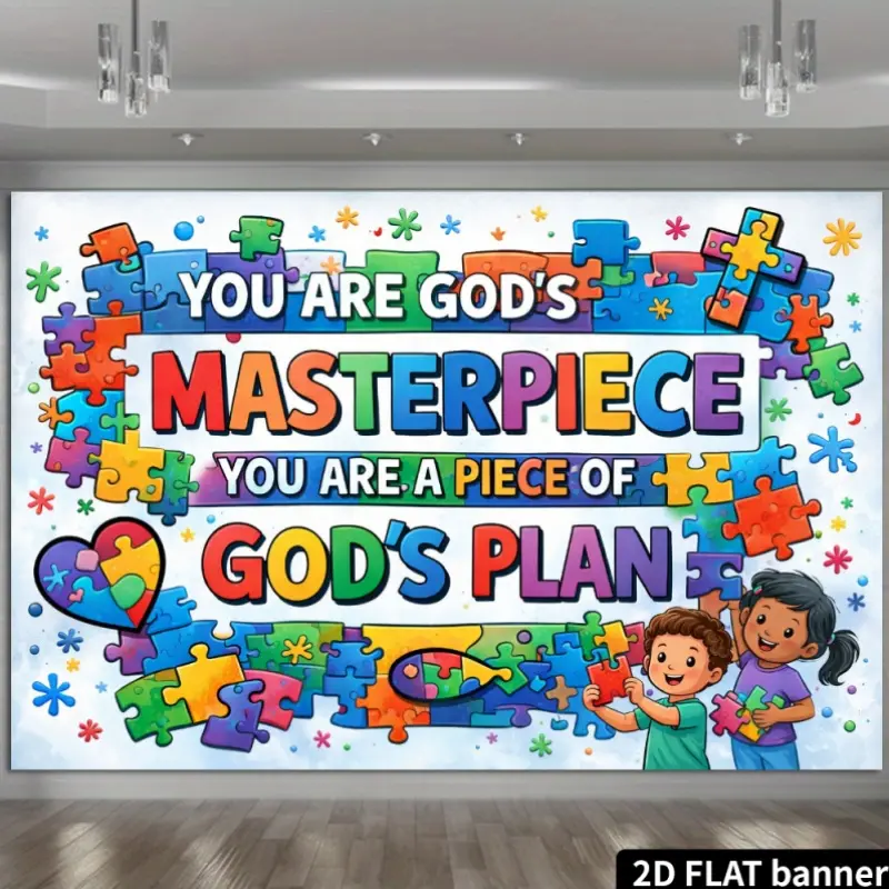 A 2D Colorful Puzzle Fish Backdrop with a Religious Theme, Featuring a White Base with a Colorful Puzzle Border, Multicolored Artistic Text, Colorful Puzzle Pieces, Colorful Puzzle Fish, Colorful Puzzle Hearts, Co