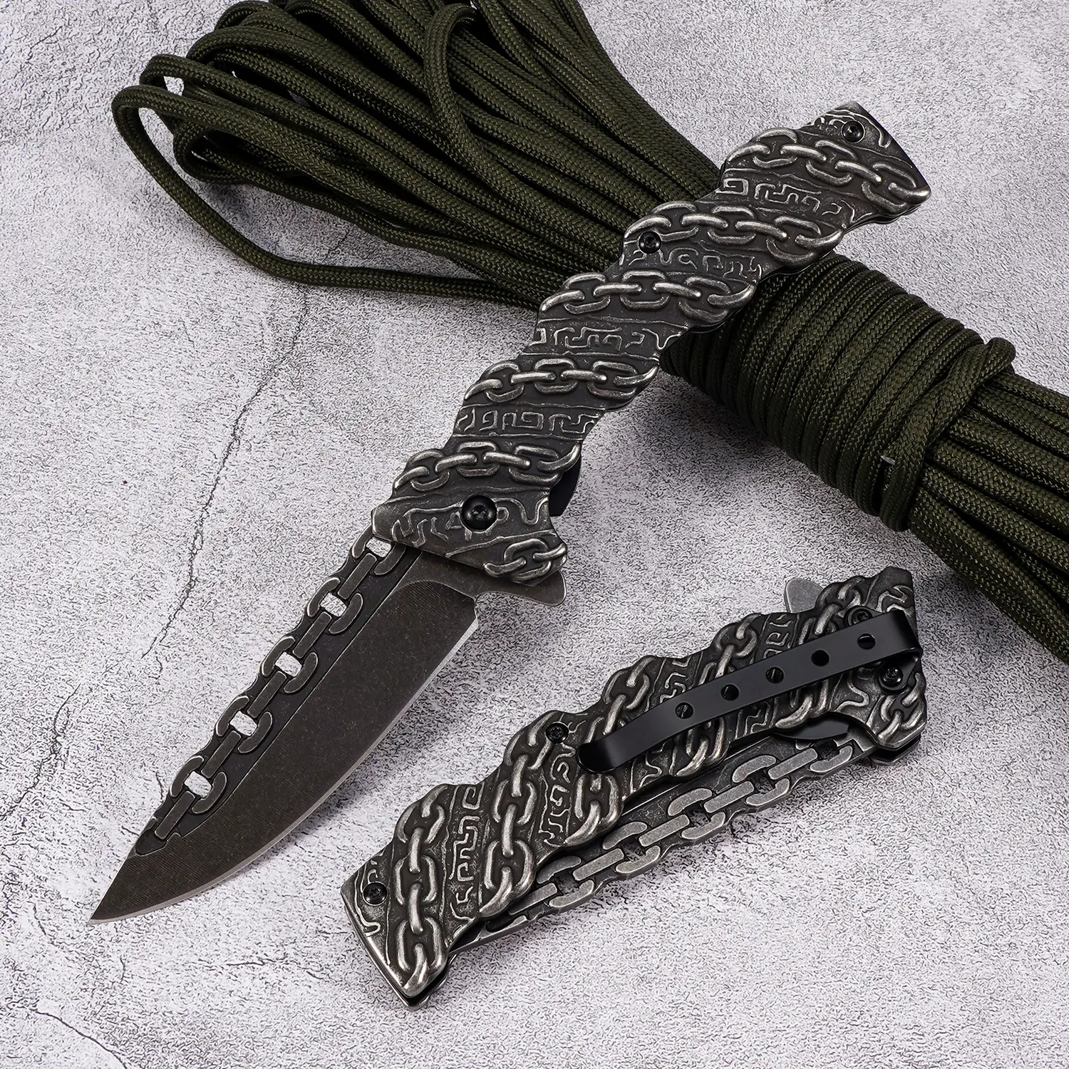 Portable EDC multifunctional lock chain tactical outdoor folding knife, all steel construction; convenient pocket/belt clip, suitable for everyday carry, hiking, camping; outdoor cutting tool designed specifically for climbing and fishing.