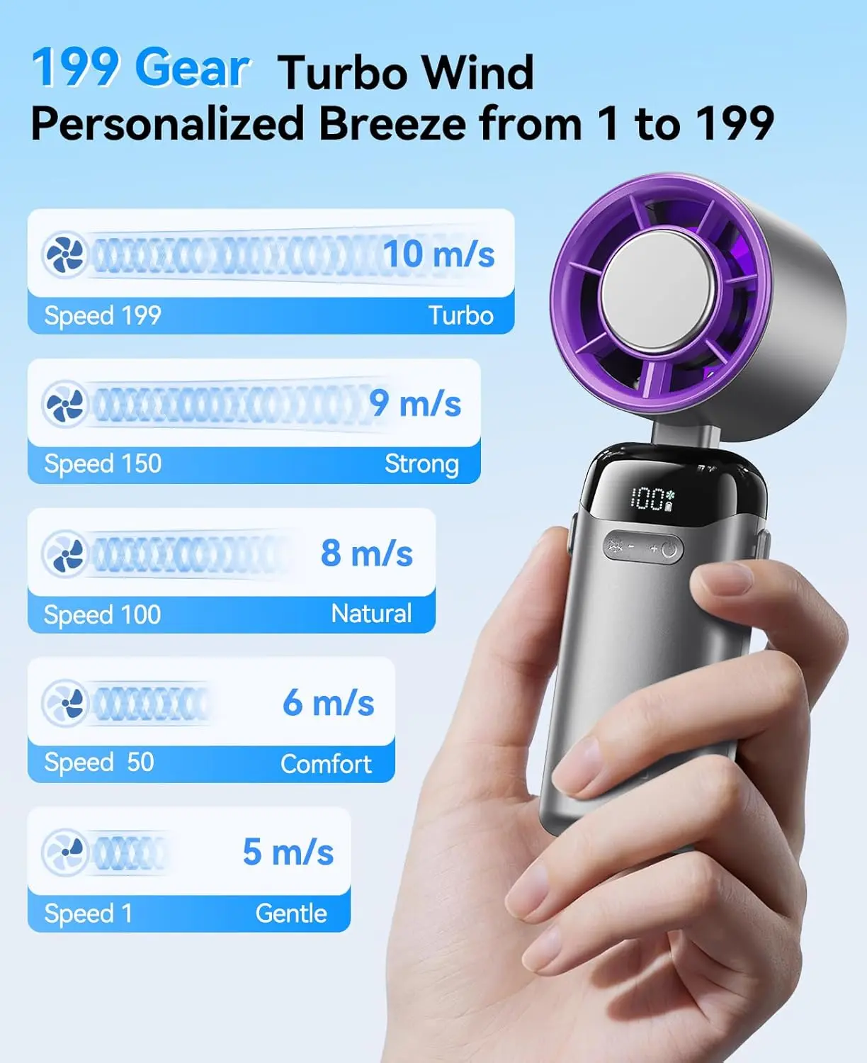·199-Gear Adjustable Wind Speed: 199 custom wind speeds, from gentle sleep mode to max turbo, cooling in 1 second for office, gym, outdoor and travel use.