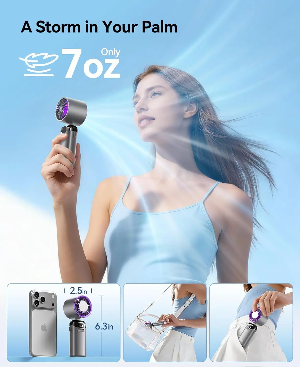·Ultra-powerful 21,000 RPM Turbo Cooling: The 21,000 RPM motor generates a 9 m/s breeze—2x stronger than regular turbo fans and 3.6x stronger than basic handheld fans, redefining portable cooling.