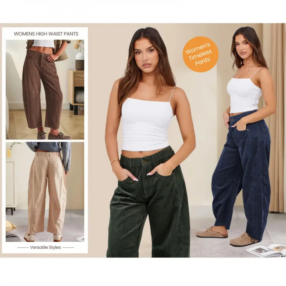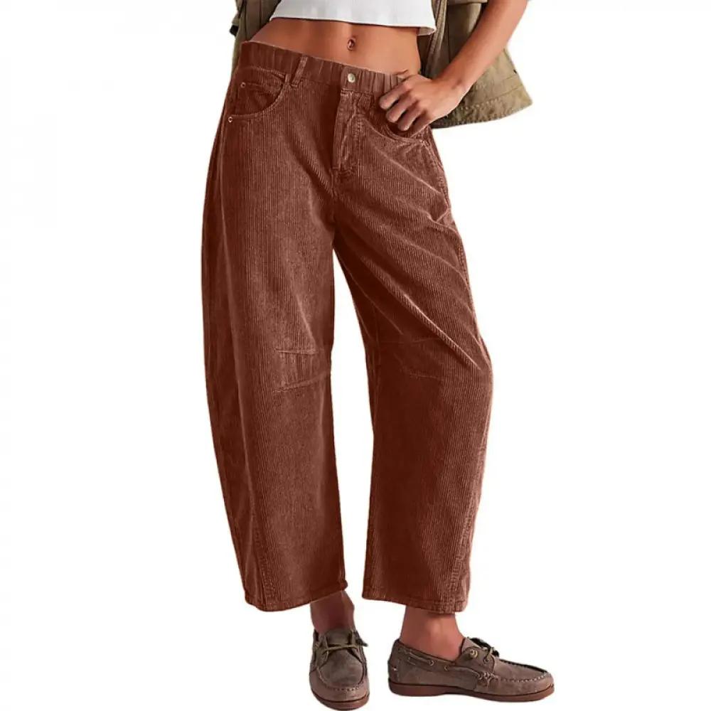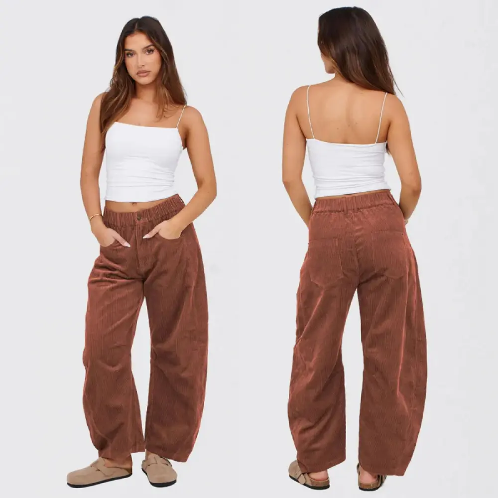 These women’s corduroy pants are designed for effortless comfort and style.With a soft elastic waistband and secure button closure, they sit comfortably at the mid-rise, giving you a relaxed fit that’s easy to wear all day.The four-pocket design and belt loops add everyday practicality, while the vintage barrel leg creates a modern wide-leg silhouette that tapers gently at the ankle.