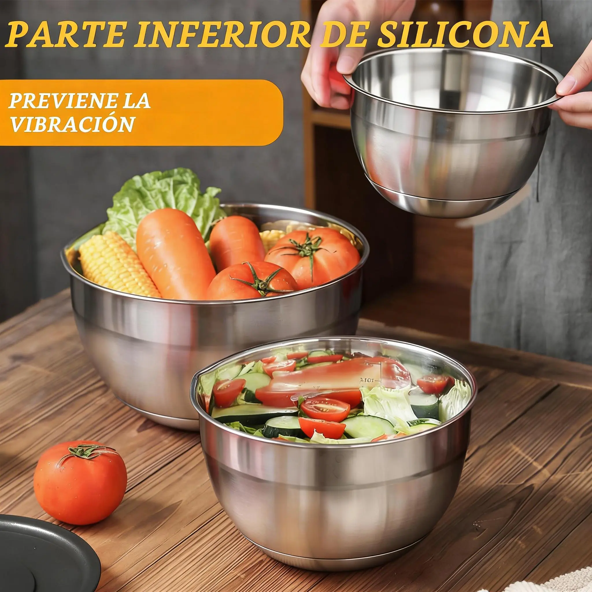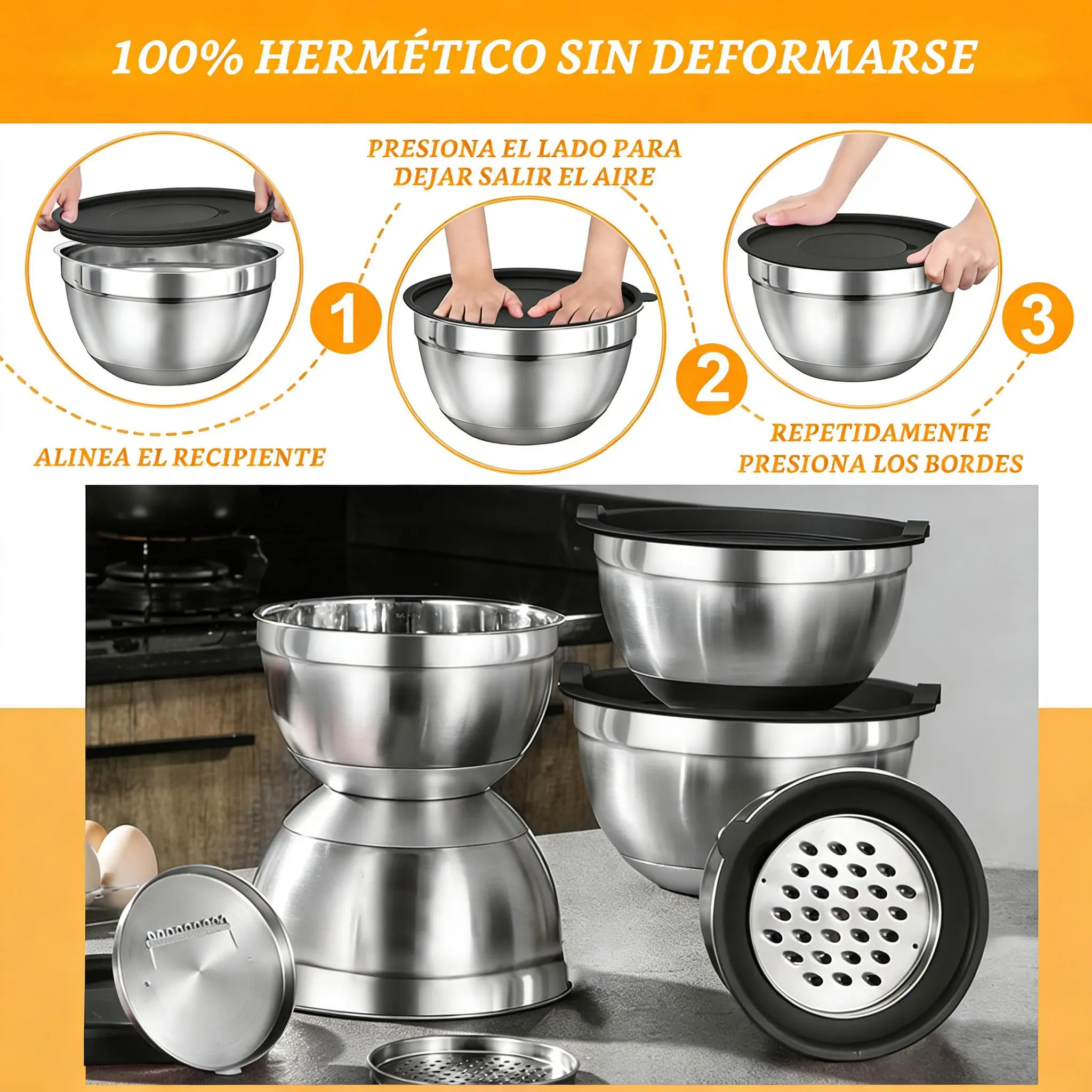 Están muy bonitos todos traen tapadera y uno trae tapa especial y accesorios adicionales para rallar alimentos y unos utensilios como para hacer pasteles