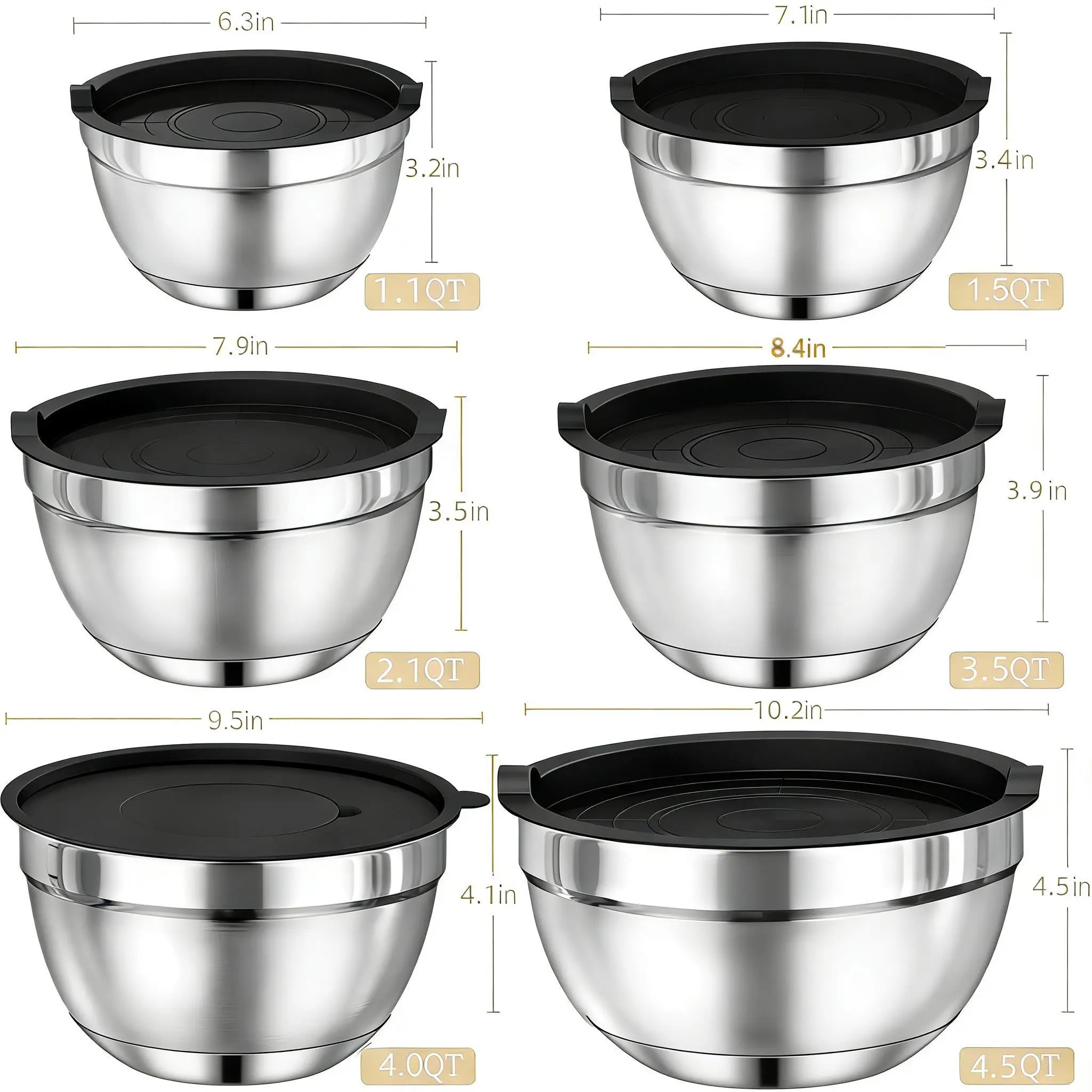 ·6 SIZES BOWLS & EXTRA KITCHEN TOOLS SET: The range of sizes from 7QT down to 1QT. Each bowl comes with a QT label to make it easier to choose the right size, Bowl sizes fit on standard-size refrigerator shelves and cabinets. Comes with a brush, spatula, whisk, measuring spoons