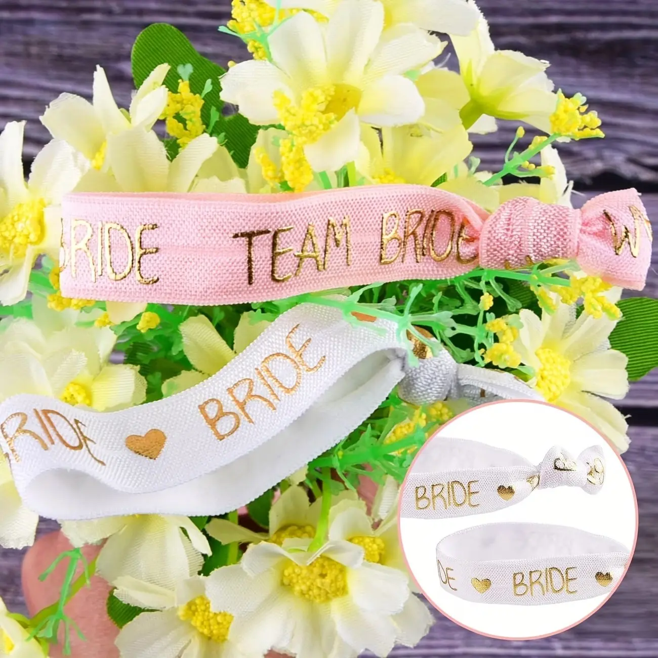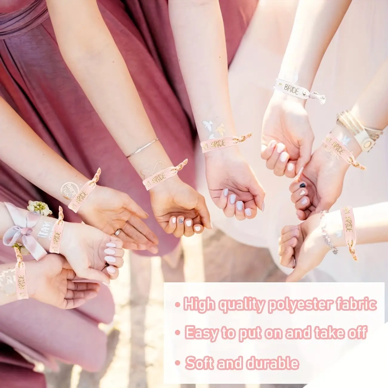【Bride Squad Bands】: Pink bands with "Team Bride" text help create a cohesive look for the bride squad.