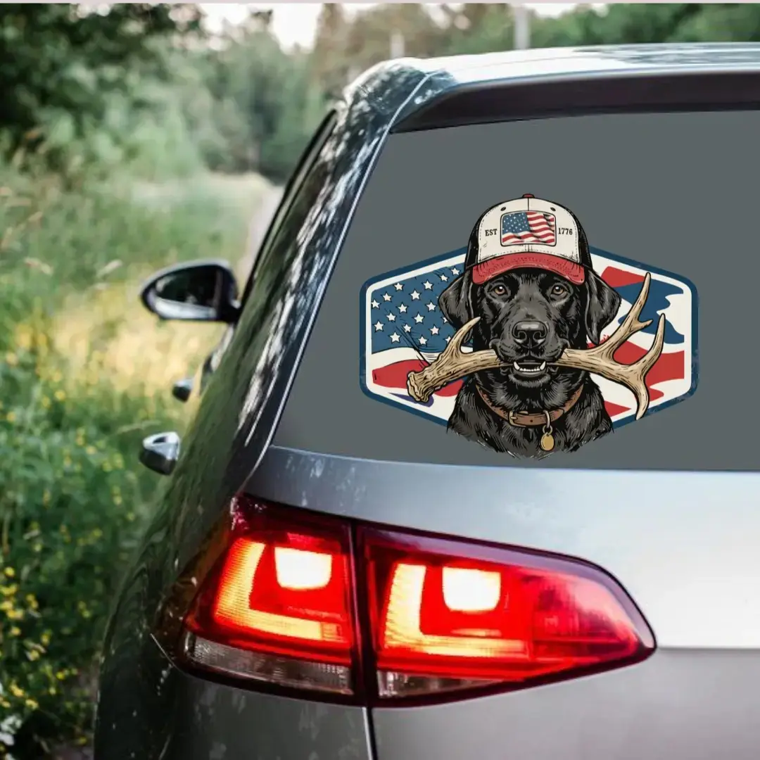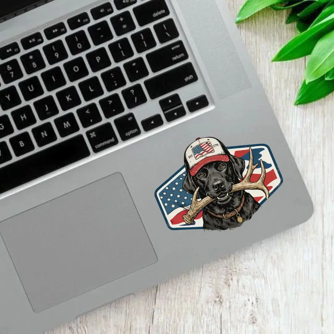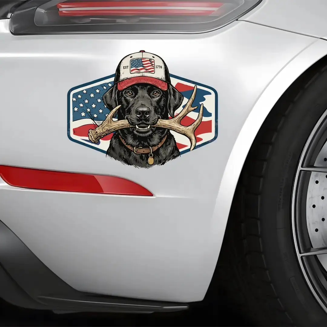 5. Black Lab Hunting Dog Sticker, Patriotic USA Flag Vinyl Decal, Retriever with Antlers Outdoor Sticker for Car Window Laptop